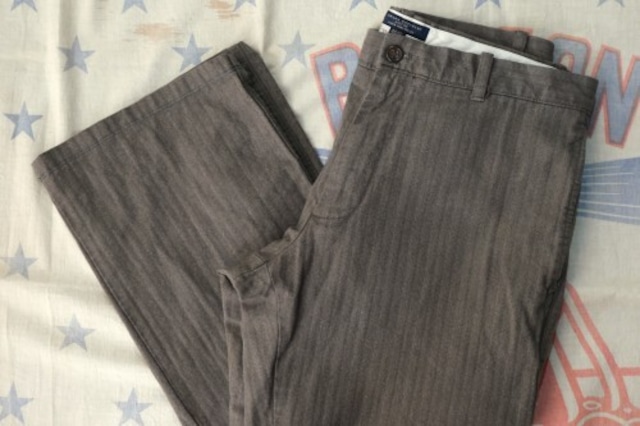 1978年にカリフォルニア州ミルバレーで創業された"BANANA REPUBLIC"から2000年代(08/FALL)のパンツ。程よい厚さで控えめなヘリンボーン・ツイル×ピン・ストライプを組み合わた100%コットン素材を使用し、アッシュブラウンとグレーの混じり合うナチュラルな色味に大人な雰囲気を感じるアイテムです。やや浅めの股上にすっきりとした印象のノータック、太めのワタリから裾口にかけてストレートに落ちるワイドなシルエットが特徴となっています。着用の上で問題となるダメージや汚れはございませんが、全体的に着用感のあるUSEDコンディションですのでご理解の上ご検討ください。ゆったりとリラックスして履いていただける太いシルエットと落ち着いた色味で、ドレスとカジュアルの中間といったバランスの良いおすすめの1本です。 □size: 表記34/32 ウエスト 88cm(35inch)/ 股上 28.5cm/ 股下 69cm(短め)/ ワタリ 30cm/ 裾幅 25cm □material: 100% cotton □color: アッシュブラウンとグレーの混じり合った色味 □condition: ☆☆☆☆☆(着用感のあるUSEDコンディションです) □label: BANANA REPUBLIC □Made in Sri Lanka ――――――――――――――――――――― 実店舗との同時販売を行っておりますのでタイムラグによる売り切れの場合はご注文を頂いた商品をご用意できない場合もございます。予めご了承下さいますようお願いいたします。また、ご覧頂いているモニターにより実際の色と出方が異なる場合がございます。 下記リンクから『CUSTOMER GUIDELINES』を必ずお読みになってからご注文下さい。 https://www.garyovintage.com/customerguide.html