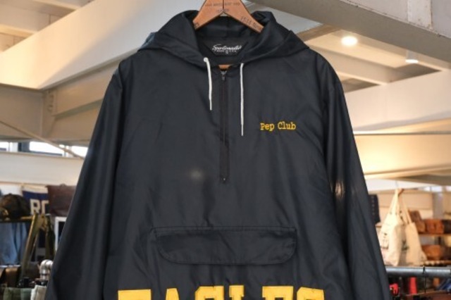 1924年にメリーランド州ボルチモアで設立された"Sportsmaster"から80年代頃のアメリカ製プルオーバー・ジャケット。薄手でマットな光沢を持つ高密度の100%ナイロンを使用し、単色ブラックの色味がスマートでシンプルな仕上がりのアイテムです。ざっくりとした着用に適したハーフジップ・プルオーバー、フード付き、胸元のカンガルー・ポケットは裏返すと収納可能なパッカブル仕様、左胸に刺繍で入る"Pep Club"そして腹部にイエローのパッチで施された"EAGLES"が個性的なデザインとなっています。着用の上で問題となるダメージや汚れはございませんが、全体的に着用感のあるUSEDコンディションですのでご理解の上ご検討ください。厚手のトップの上から着用しても窮屈にならない大きめのシルエットによって合わせるもの次第でフルシーズン楽しんでいただけ、脱いでもかさばらない軽さとパッカブル仕様でひとつ持っているとたいへん重宝しそうです。 □size: 表記M (M-L位) 肩幅 48cm/ 身幅 59cm/ 着丈 71cm/ 袖丈 65cm □comment: Model (171cm/ 58kg) 「全体的に丁度良いサイズ感でした」 □material: 100% nylon □color: ブラック □condition: ☆☆☆☆☆(着用感のあるUSEDコンディションです) □label: Sportsmaster □Made in U.S.A. ――――――――――――――――――――― 実店舗との同時販売を行っておりますのでタイムラグによる売り切れの場合はご注文を頂いた商品をご用意できない場合もございます。予めご了承下さいますようお願いいたします。また、ご覧頂いているモニターにより実際の色と出方が異なる場合がございます。 下記リンクから『CUSTOMER GUIDELINES』を必ずお読みになってからご注文下さい。 https://www.garyovintage.com/customerguide.html