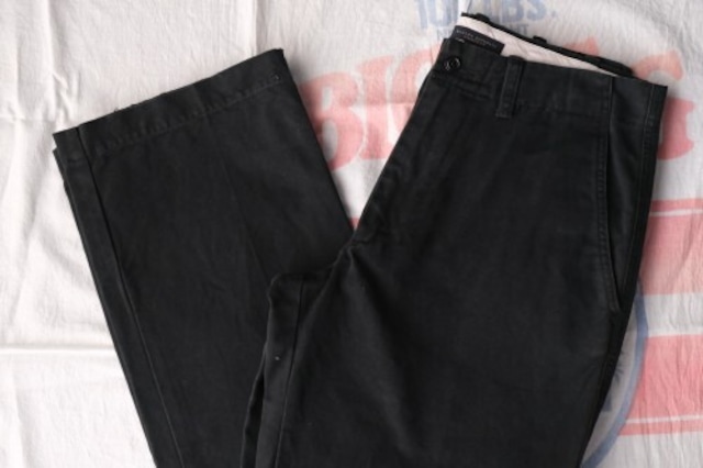 1978年にカリフォルニア州ミルバレーで創業された"BANANA REPUBLIC"から2000年代(06/FALL)のパンツ。厚手で表面に凹凸のある100%コットン・ダック地を使用し、単色ブラックのスマートな色味に魅力のあるアイテムです。程よい深さの股上にすっきりとした印象のノータック、太めのワタリから裾口にかけてほんのりとテーパードを効かせたストレート・シルエットが特徴となっています。着用の上で問題となるダメージや汚れはございませんが、後部のウエスト・ベルトと後部の両裾口の縁に擦り切れ、全体的に着用感のあるUSEDコンディションですのでご理解の上ご検討ください。ゆったりとリラックスして履いていただける太いシルエットと落ち着いた色味で、カジュアルながら大人っぽい印象を演出できるおすすめの1本です。 □size: 表記32/34 ウエスト 82cm(32inch)/ 股上 29cm/ 股下 87.5cm/ ワタリ 31cm/ 裾幅 25cm □material: 100% cotton □color: ブラック □condition: ☆☆☆☆★(擦り切れのあるUSEDコンディションです) □label: BANANA REPUBLIC □Made in India ――――――――――――――――――――― 実店舗との同時販売を行っておりますのでタイムラグによる売り切れの場合はご注文を頂いた商品をご用意できない場合もございます。予めご了承下さいますようお願いいたします。また、ご覧頂いているモニターにより実際の色と出方が異なる場合がございます。 下記リンクから『CUSTOMER GUIDELINES』を必ずお読みになってからご注文下さい。 https://www.garyovintage.com/customerguide.html