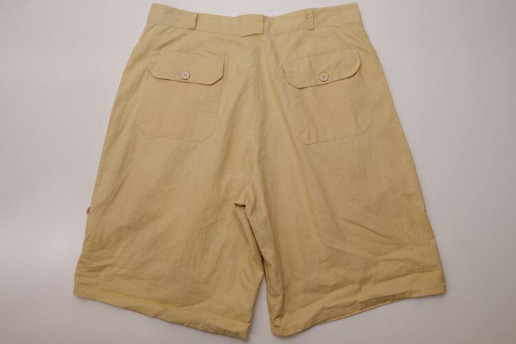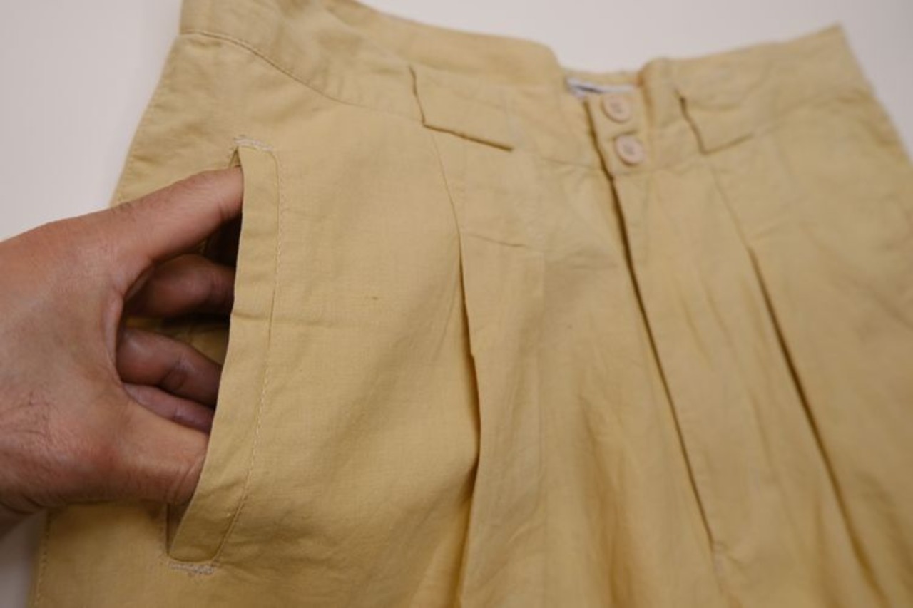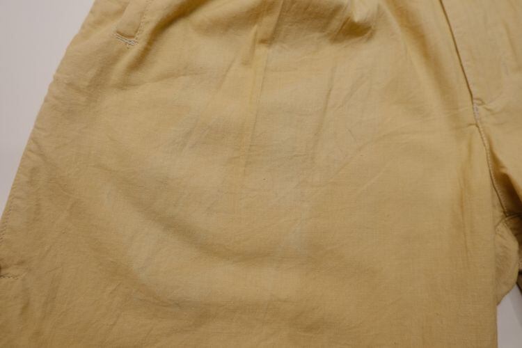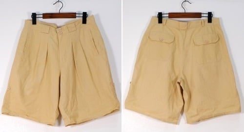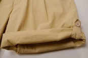 80年代マスタード色のハイウエストキュロット。洗い晒したコットンの素材感に、古いものならではの魅力を感じる一品です。股上の深いハイウエストフィットに、タック入りのざっくりストレートシルエット、裾はロールアップしてストラップで留め、お好きなレングスでお楽しみいただけます。粗めに織り上げられた薄手のコットン生地は吸水性、速乾性に優れ、素肌にも柔らかな肌触りで真夏の着用にも快適です。コンディションとして多少の着用感があり、右フロント裾広範囲にぼんやりとした変色が見られますのでUSED品とご確認の上ご検討ください。淡いマスタードカラーが幅広いトップスにマッチし、コーディネートを明るく彩ります。
