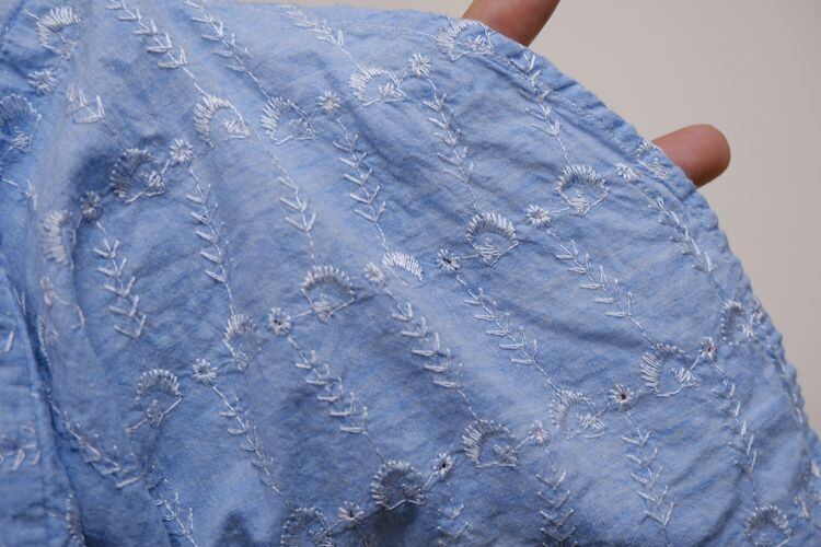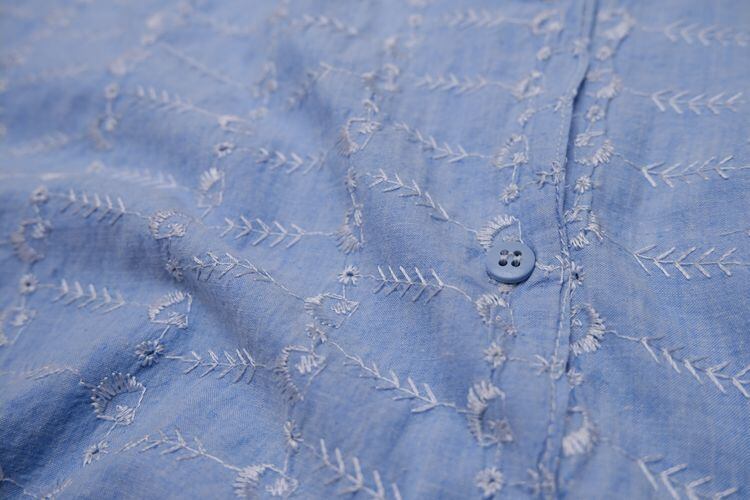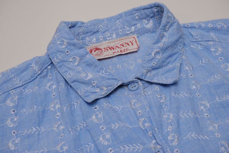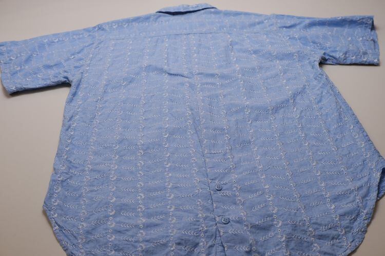 60年代総刺繍のシャンブレーシャツ。洗い晒した古いシャンブレー生地全面に施された白い刺繍が可憐なヴィンテージシャツです。ゆったりとしたクラシックフィット、ボタン付きのロングテールが特徴のシルエット。薄手のコットン生地は古いものならではの風合いに優れ、刺繍の凹凸感により肌に触れる面が少なくさらりと涼しい着心地でお楽しみいただけます。コンディションとして多少の着用感があり、所々に刺繍糸の引きつれやほつれなど見られますので年代もののUSED品とご確認の上ご検討ください。一目で古いものと判る素材感がスタイリングに存在感を与え、シンプルなボトムスに合わせるだけでもでもこなれた着こなしを演出してくれます。
