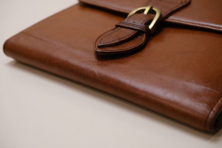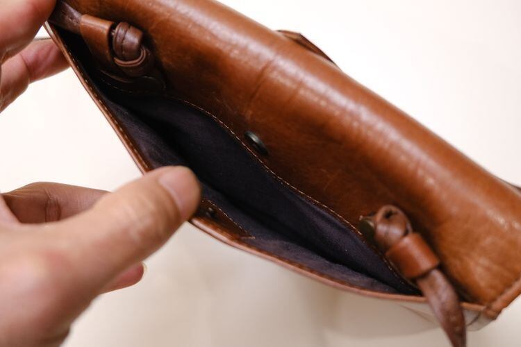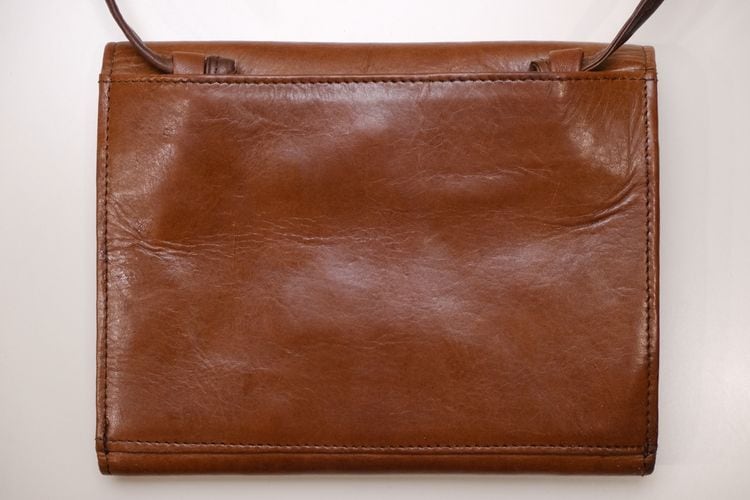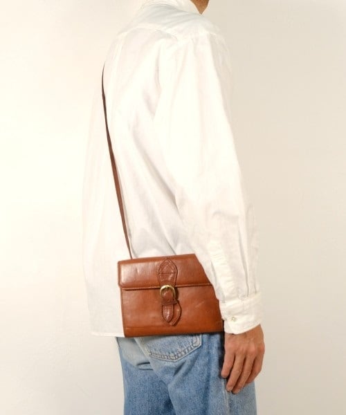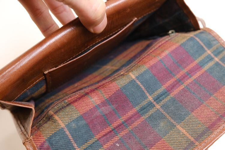 80年代頃と思われるハンドクラフトのレザー・ショルダー・バッグ。薄手でナチュラルなシボの表情と飴色に変化した美しいレザーを使用し、無駄な装飾を施さないすっきりとしたデザインに魅力のあるアイテムです。コンパクトなサイズ感ながら、ボタン留めのフラップを外すと内側には多数のカード・スロット、ファスナー付きポケット、ペン挿し、背面にもポケットが配され見た目以上の高い収納力、そして内側に張られたタータンチェックがさりげないアクセントとなっています。ご愛用の上で問題となるダメージや汚れはございませんが、スレやキズのあるUSEDコンディションですのでご理解の上ご検討ください。ショルダー・ストラップは取り外し可能で、ウォレットとしてもお使いいただけ。本革らしい素材の表情がたいへん良く、ありそうで意外にないデザインですので気になる方は是非ご検討ください。