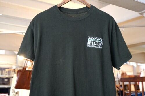 "WOODLAND MILLS"ロゴ・Tシャツ。程よい厚さでぱりっと張りのある100%コットン(表記なし)を使用し、フォレストグリーンのボディにアメリカ・カナダを拠点とするポータブル製材機のパイオニア"WOODLAND MILLS"社の刺繍ロゴが映えるアイテムです。着用の上で問題となるダメージや汚れはございませんが、全体的に毛羽立ちのあるUSEDコンディションですのでご理解の上ご検討ください。ショーツやデニム・パンツにさらっと合わせるだけで、コーディネートのアクセントになるおすすめの1本です。