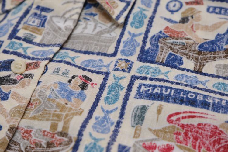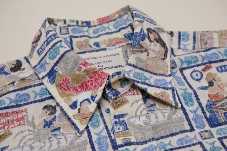 1956年創業の老舗ハワイアン・シャツ・ブランド"REYN SPOONER"『レイン・スプーナー』から2000年代初期頃と思われるコレクション・ラインの半袖シャツ。程よい厚さでぱりっと張りのあるコットン×ポリエステル(60/40)混紡素材を使用し、ハワイの伝説的なアーティスト"Dietrich Varez"によるポップでカラフルな絵柄が印象的なアイテムです。すっきりとした着用に適したやや細身のシルエット、美しく柄合わせのされた胸ポケットと前たて、ローカルなハワイのシーフード・マーケットを切り取ったイラストは裏地使いよるかすれ感を活かしながら、洗練されたヴィンテージ感を演出しています。全体的に着用した様子のあまり感じられないたいへん良いコンディションですが、あくまでUSED品とご理解の上ご検討ください。カジュアルさを備えつつも大人っぽい落ち着きを感じる色味と絵柄は、幅広いボトムスにさらっと合わせるだけでリゾート感のある爽やかな着こなしを楽しめる1本です。