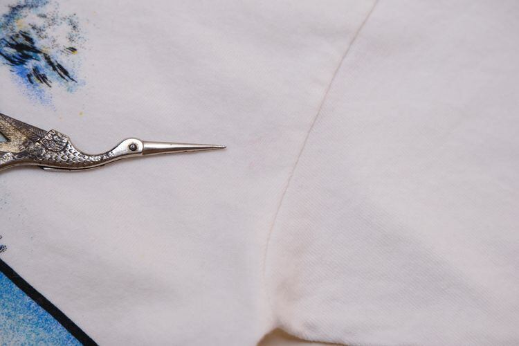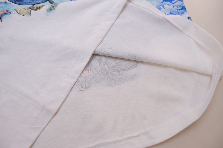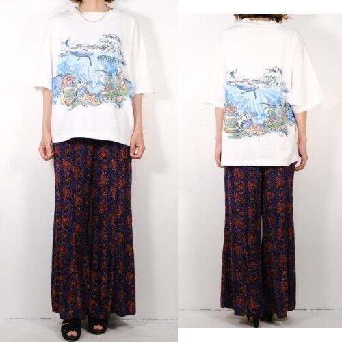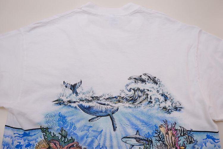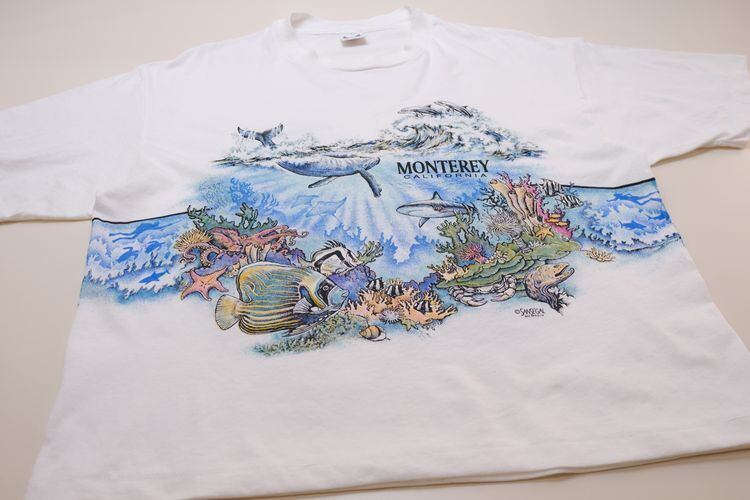 90年代オーシャンプリントのホワイトTシャツ。アメリカ・カリフォルニア州モントレーのスーベニアTシャツで、豊かな自然の海中風景を細かな点描で描いたイラストレーションが素敵な一品です。丈詰めが施されたXLサイズのボディは正方形に近いスクエアシルエットが新鮮な雰囲気な印象になり、オーバーサイズの着こなしに向きます。やや薄手の100%コットン生地はかさ張らない生地感と肌触りの良さが魅力です。コンディションとして多少の着用感があり、左脇付近に僅かなインク汚れなど見られますのでUSED品とご確認の上ご検討ください。ぐるりと一周取り巻くようなプリントが目を引き、バックスタイルにも個性が溢れます。