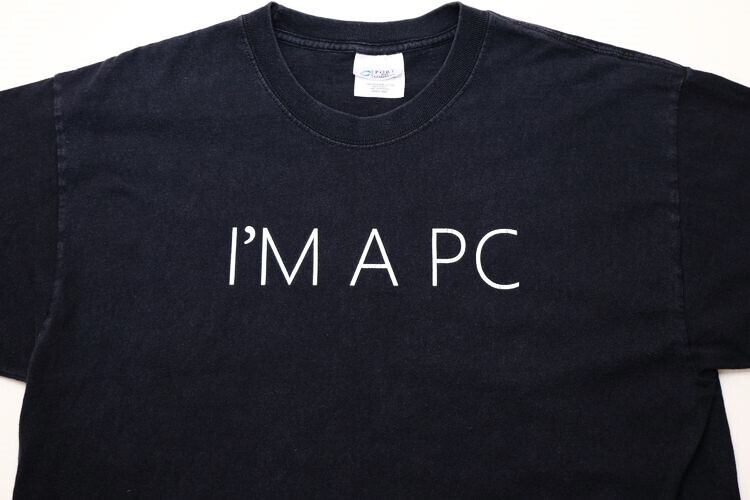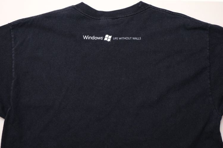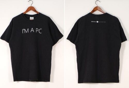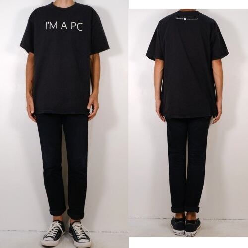 アメリカ・ワシントン州レドモンドに本社を置く"Microsoft"が2008年頃に展開していた"I'M A PC"キャンペーンのプロモーションTシャツ。程よい厚さでしっかりと張りのある100%コットン(PORT and COMPANY)を使用し、ブラックのボディに"I'M A PC"の潔いワン・フレーズ、バックに"Windows"ロゴと"LIFE WITHOUT WALLS"のスローガンを配した企業カルチャーを象徴するインパクト抜群のアイテムです。着用の上で問題となるダメージや汚れはございませんが、全体的に着用による色褪せや毛羽立ち、プリントにクラックのある着古されたコンディションですので、この新品とは違うこなれた雰囲気を好まれる方におすすめ致します。幅広いボトムスにさらっと合わせるだけでテック・カルチャーを落とし込んだスタイルを楽しめ、こちらは"Apple"の"I'm a Mac"広告への対抗として話題を呼んだキャンペーンで製作されたイベント限定の希少なノベルティですので気になる方は是非ご検討ください。