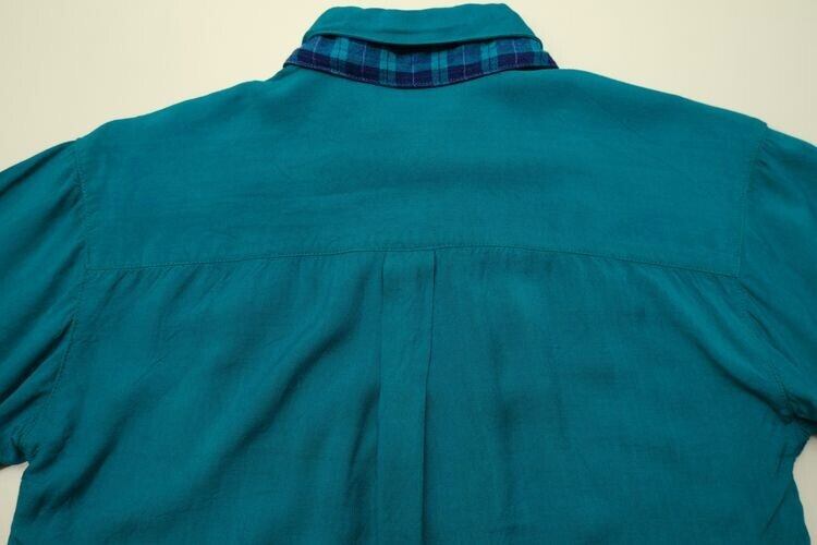 80年代レイヤードカラーのレーヨンシャツ。襟や前合わせ、ポケットに袖口がそれぞれ2枚重ねたように見せるデザインがユニークな一品です。ゆったりとした身幅に短めの着丈が特徴のボックス型がクラシックな印象。100%レーヨン生地はくたり柔らかな落ち感が特徴で、素肌にも気持ち良い肌触りも魅力です。とくに目立ったダメージはございませんが、多少の着用感や生地の歪みなど見られますのでUSED品とご確認の上ご検討ください。珍しいデザインと発色の美しいグリーンの色みに古いものならではの個性が溢れ、シンプルな着こなしでも十分な存在感のあるアイテムです。
