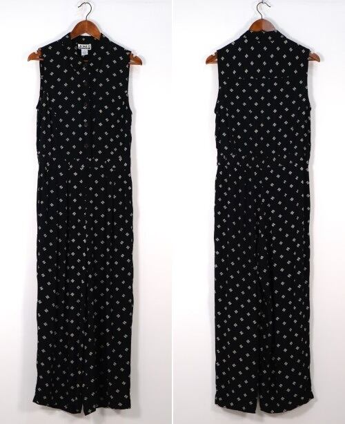 洗練されたデザインが支持を集めるニューヨークを拠点としたライフスタイルブランド"JONES NEW YORK"の"JONES STUDIO"ラインより、 90年代レーヨンのジャンプスーツ。ノースリーブシャツスタイルが媚びない大人顔の一品です。華奢な肩幅と小振りなラペルが特徴のシャツスタイルのトップに、ハイウエストにタック入りのゆったりワイドシルエットのクロップド丈パンツ。ウエスト後ろにゴム入り、ウエストにベルトループが付属したデザイン。鈍い光沢のあるレーヨンクレープ生地はひんやり涼しい触感と滑らかなドレープ感が特徴で、軽量で肌触り良くリラックスした着心地でお楽しみいただけます。コンディションとして多少の着用感があり、左肩に生地のリペアが見られます。柄のためさほど目立ちませんが、USED品とご確認の上ご検討ください。そのままでシンプルな着こなしも、ベルトやスカーフなどでウエストマークした着こなしも素敵です。