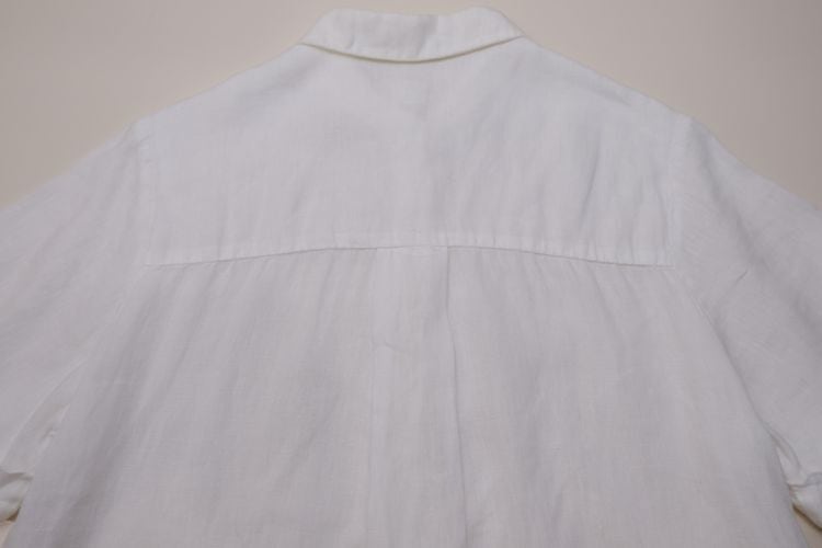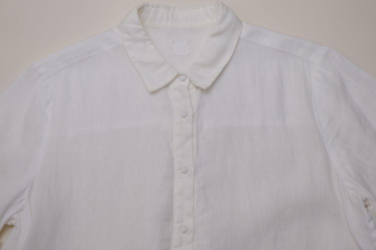 1990年イタリア・ボローニャにて設立されたファッションブランド"120%lino"より、ホワイトリネンのシャツドレス。イタリア語で"linen"を意味する"lino"、リネン素材を専門とするブランドで、最高ランクの素材のみを用い、自然で柔らかな風合いを引き出す独自の製法が特徴です。こちらは、そんなリネンの素材感をたっぷりとご堪能いただけるロングドレスです。ミニマルな表情のロングシャツスタイルに、小粒の包みボタンがポイントになったデザイン。透け感のある柔らかなリネン生地は肌触り良く通気性に優れ、真夏でも快適な着心地でお楽しみいただけます。とくに目立ったダメージはございませんが多少の着用感が見られますのであくまでUSED品とご確認の上ご検討ください。一枚でシンプルな着こなしも、パンツに合わせたスタイリングも素敵です。