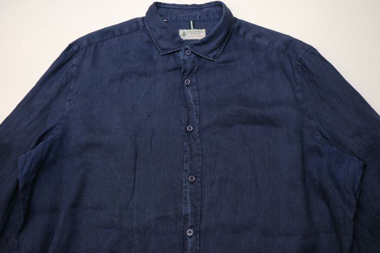 1957年にイタリア・ナポリで自身の名を冠し設立された高級シャツ・ブランド"LUIGI BORRELLI"からイタリア製のシャツ。少し粗めに織られた100%リネンを使用し、洗いざらしたような風合いのチャコールネイビーの色味と表情に渋い雰囲気を感じるアイテムです。ブランドの伝統的なモチーフを現代的にアレンジした"LUXURY VINTAGE"ラインによる1着で、肩幅に対して身幅を広くとったリラックス感のあるシルエットが柔らかなドレープを生み、マチ付き、襟の開きが水平に近いホリゾンタル・カラーが大きな特徴となっています。着用の上で問題となるダメージや汚れはございませんが、全体的に着用による色褪せや毛羽立ちのあるUSED品ですのでご理解の上ご検討ください。リネンならではのネップやシワ感がたいへん良く、カジュアルなコーディネートはもちろんジャケットスタイルにもおすすめで、通気性と速乾性の高いリネン素材ですので暑い季節に活躍する1本です。