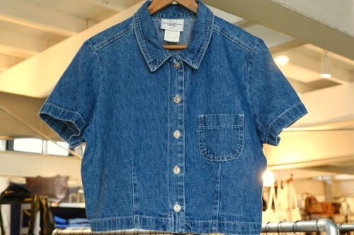 90年代ブルーデニムのクロップドシャツ。コンパクトな着丈が特徴のアンバランスなシルエットが新鮮な表情の一品です。ゆったりとした身幅やアームに、ジャストウエスト位置の着丈が特徴のボックス型、半円形のポケットやシルバーカラーのメタルボタンがポイントになったディテール。ウォッシュデニムの生地はアタリや縦落ちの生まれた色みがたいへん雰囲気良く、これから増していく味わいが期待できそうです。とくに目立ったダメージは見られませんが、多少の着用感が見られますのであくまでUSED品とご確認の上ご検討ください。ハイウエストパンツなどと合わせるのはもちろん、ボレロ感覚でドレスなどに羽織った着こなしも素敵です。