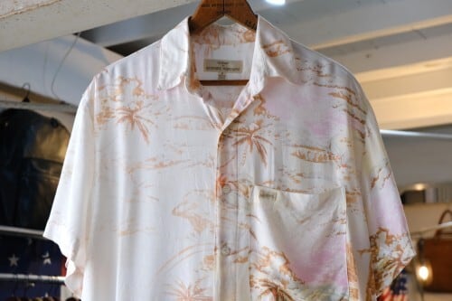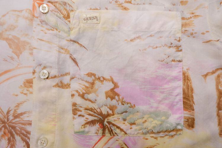 1981年にカリフォルニア州ロサンゼルスで設立された"GUESS"から、創業者である"GEORGES MARCIANO"が手掛けていた初期モデルのみに見られる"GUESS by GEORGES MARCIANO"タグの付く90年代初期頃の半袖シャツ。程よい厚さでやわらかな肌ざわりの100%レーヨン(表記なし)を使用し、オフホワイトの色味にふわっと浮かび上がるヤシの木やハイビスカスが渋い雰囲気のアイテムです。着用の上で問題となるダメージや汚れはございませんが、全体的に毛羽立ちのあるUSEDコンディションですのでご理解の上ご購入ください。ビビッドな色味が多いハワイアン・シャツの中では落ち着いた色合いで、大人っぽくシンプルなボトムスと合わせてさらっと着こなせるおすすめの1枚です。