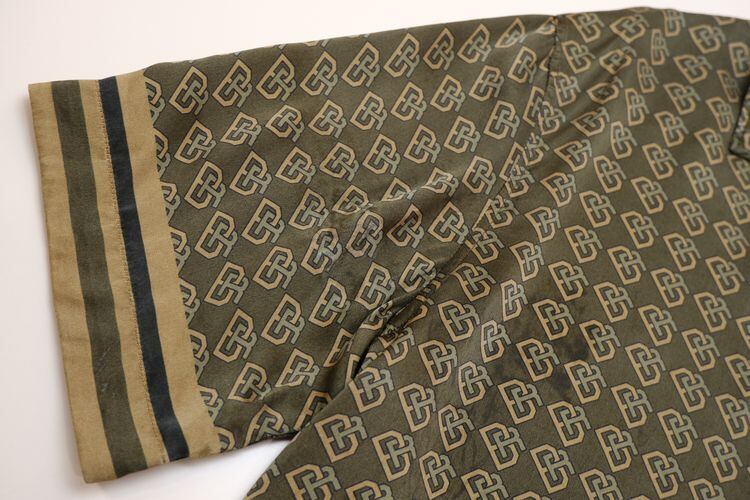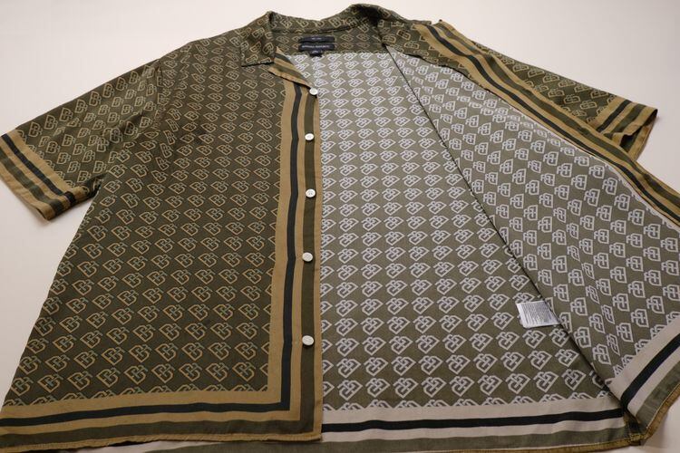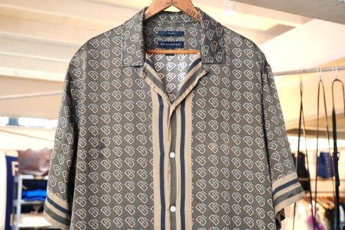 1978年にカリフォルニア州ミルバレーで創業された"BANANA REPUBLIC"から半袖シャツ。薄手で程よい光沢のある100%シルクを使用し、鈍い色味のオリーブをベースに美しく並ぶ"BR"モノグラムと各縁のストライプが個性的な仕上がりのアイテムです。リラックスした着用に適したゆとりのあるシルエット、オープンカラー×ボックス型による着用のしやすさも魅力となっています。着用の上で問題となるダメージや汚れはございませんが、左右の袖に薄っすらとした汚れと生地のよれ、右胸にも薄っすらとした汚れのあるUSEDコンディションですのでご理解の上ご検討ください。幅広いパンツにさらっと合わせるだけでルーズながら渋い雰囲気を演出でき、肌触り良く身体のラインに馴染む着心地も楽しんでいただけます。