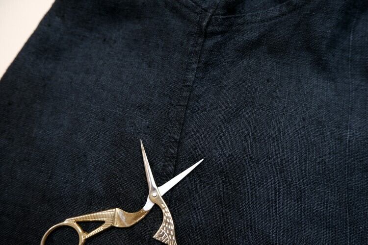 カリフォルニア州ロサンゼルスで設立された"SAUCI California"から80年代頃と思われるジャケット。ハーベスト・サック『収穫袋』のような粗く織られた100%リネン(表記なし)を使用し、ポケットを境に上部はアッシュネイビー、下部はアッシュブラックがグラデーションを掛けて切り替わる2トーンが独特な雰囲気のアイテムです。リラックスした着用に適した身幅が広く、アーム・ホールの太いざっくりとしたシルエット、2つのアウト・ポケット、すっきりとした印象を生むチャイナ・カラー、個性を際立たせる前合わせのチャイナ・ボタンが個性的な仕上がりとなっています。着用の上で問題となるダメージ汚れはございませんが、右脇下の前後にダメージ補修のあるUSED品ですのでご理解の上ご検討ください。シンプルなトップとパンツにラフに羽織るだけでこなれたスタイリングが完成し、着丈の長いオールド・チャイナボタンのリネン・ジャケットはたいへん珍しいため気になる方は是非ご検討ください。