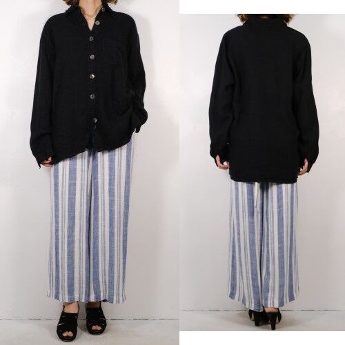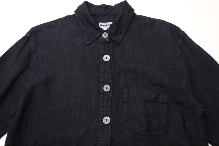 80年代ブラックカラーのヘビーリネンシャツ。粗く織り上げられたリネンサック生地の風合いが素晴らしい、ロングスリーブシャツです。ワークやミリタリーを感じさせるようなミニマルなボディに、裏面を使用した大きな貝ボタンが深みのある表情を添えています。生地は鈍い光沢と粗々しい自然のシャリ感、厚みがありながらも柔らかな風合いが特徴で、通気性に優れ快適な着心地でお楽しみいただけます。コンディションは良く、とくに目立ったダメージは見られません。一枚での着こなしはもちろん、アウターとしても雰囲気良く、ロングシーズン活躍してくれる逸品です。