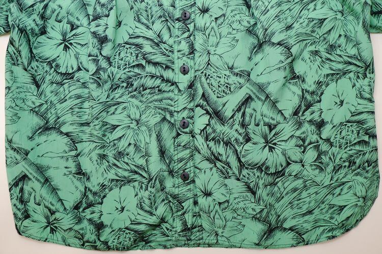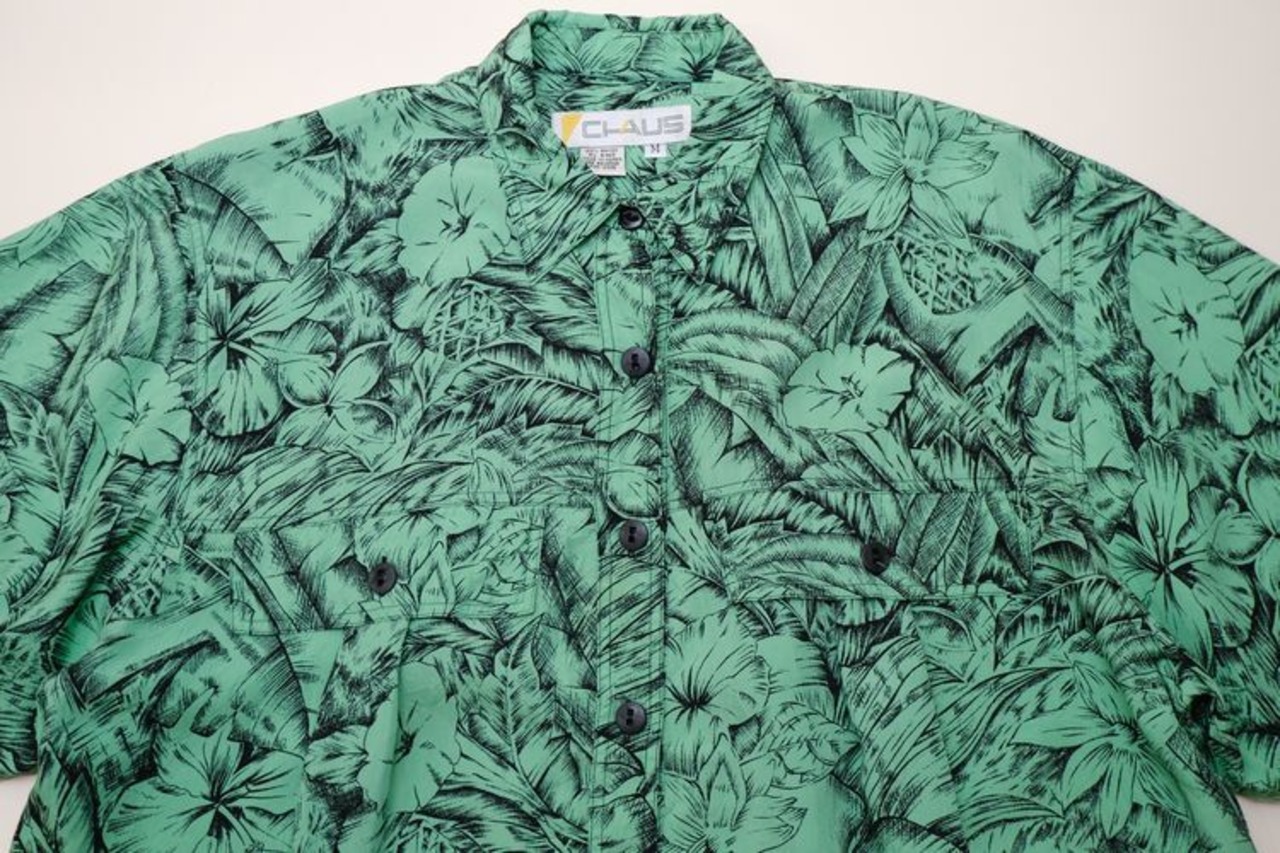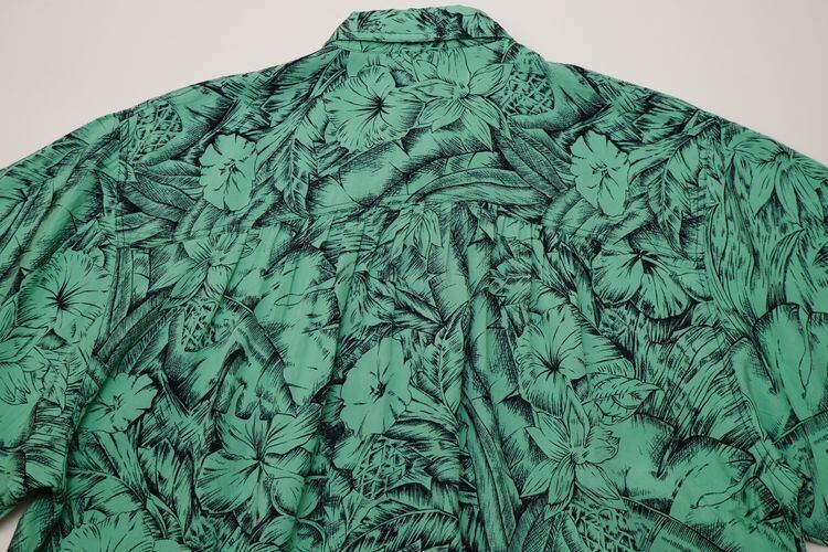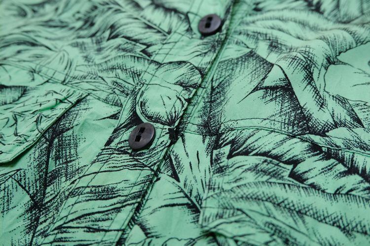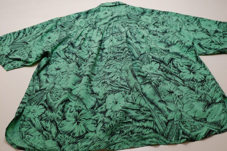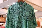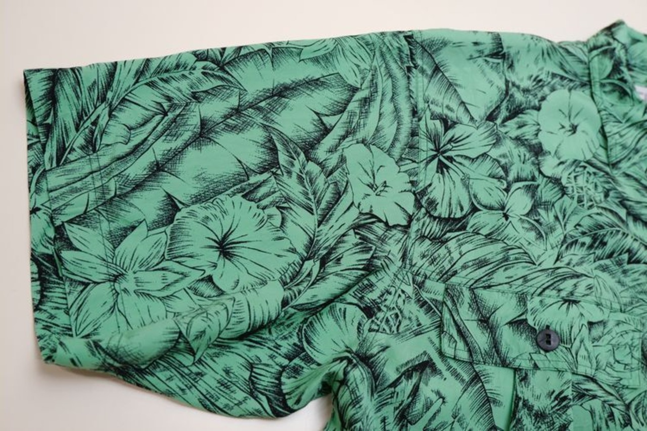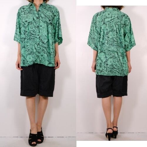 80年代ドローイング柄レーヨンの半袖シャツ。色鮮やかなグリーンベースに、鉛筆でさらさらと描いたようなボタニカルプリント柄が映えるアイテムです。オーバーサイズのメンズライクなフィットに背中のギャザーがほんのり女性らしく、ゆったりとリラックスした着心地でお楽しみいただけます。コンディションは良く、とくに目立ったダメージは見られません。くたりと落ち感のある素材が大人の雰囲気で、タックインの着こなしもバランスよく纏まります。
