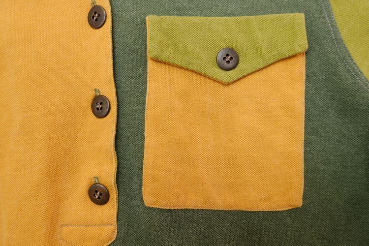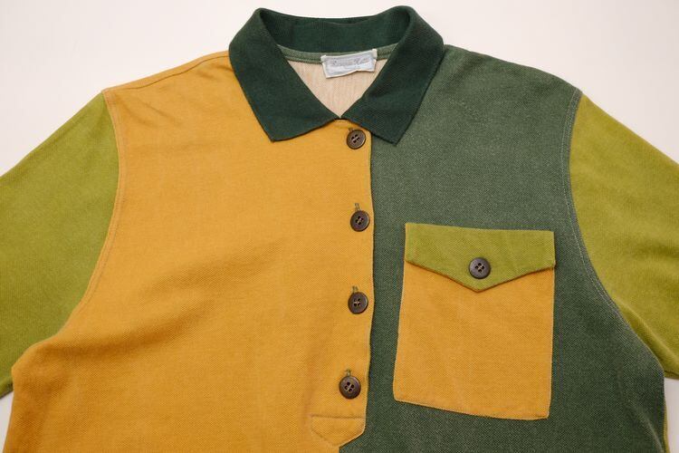 80年代イタリア製クレイジーパターンの鹿の子シャツ。大胆なカラー切り替えのデザインが目を引く、変わり種のポロシャツです。ゆったりめのボックス型シルエットに、フラップポケットやメタルボタンが存在感のあるディテール。ボックスプリーツにボタンをあしらったバックスタイルがさらに個性的な表情を加えています。コンディションとして多少の着用感があり、全体的に若干の色褪せ、後ろ中央裾付近に小さな生地のリペアなど見られますのでUSED品とご確認の上ご検討ください。少し力の抜けたゆるい雰囲気が可愛らしく、リラックスしたスタイリングに馴染みそうです。