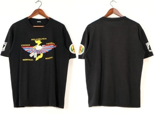 1989年に設立された"Philadelphia Vietnam Veterans Memorial Society"によって製作された90年代初期頃のTシャツ。やや薄手でやわらかな肌触りのコットン×ポリエステル(表記なし/50×50)混紡素材を使用し、フロントにはベトナムの地図を背景に、ドッグタグを咥えた星条旗カラーの翼を広げる白頭鷲、両袖にはそれぞれ"POW-MIA/ Prisoner of War/ Missing in Action" and "Still Missing but not Forgotten"というメッセージが込められたロゴ・プリントが施されています。着用の上で問題となるダメージや汚れはありませんが、所々に小さな汚れ、フロントに裾口の一部にステッチ補修、全体的に毛羽立ちの強いUSED品ですのでご理解の上ご検討ください。アメリカのミリタリー・カルチャーや歴史を色濃く反映した1着で、シンプルなパンツに合わせるだけで十分な存在感を放つTシャツです。