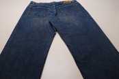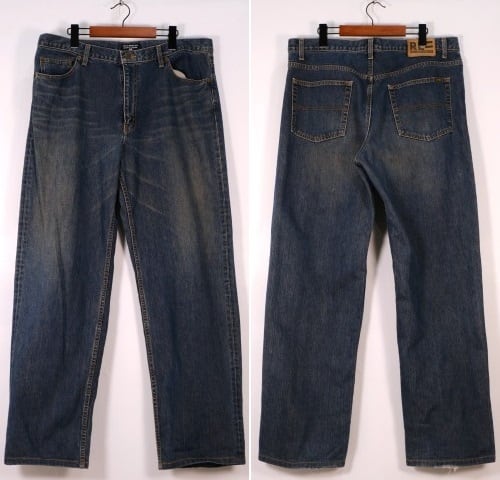 1996年に誕生し2007年で幕を下ろした"Ralph Lauren"のカジュアル・ライン"POLO JEANS CO."から2000年代初期頃と思われるパンツ。厚手でしっかりとした100%コットン・ツイル(表記なし)を使用し、インディゴにブラウンの染糸が織り込まれたことで生まれる独特のトーンと着用と経年により変化した色味やアタリに1点ものらしい魅力を感じるアイテムです。腰まわりにゆとりのある深い股上、広いワタリから裾口に掛けてテーパードを効かせたバギー・シルエットでルーズなコーディネートに適したデザインとなっています。着用の上で問題となるダメージや汚れはございませんが、後の両裾口の縁にダメージ、着用による色落ちのあるUSEDコンディションですのでこの風合いを好まれる方におすすめ致します。この年代らしい独特なデニムの色味とエイジング加工では表現できない色落ちがたいへん魅力的で、シンプルなトップにさらっと合わせて楽しんでいただける1本です。