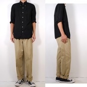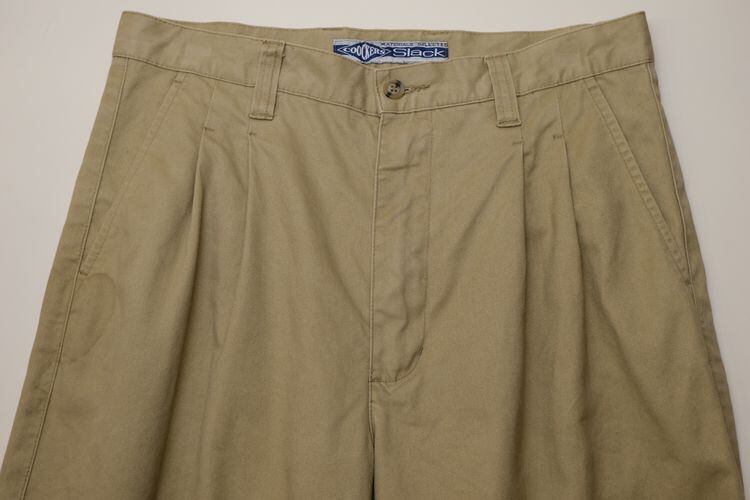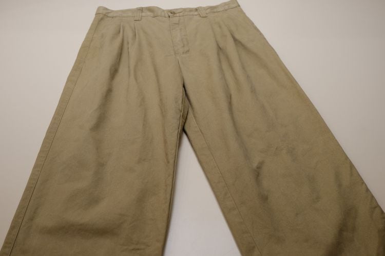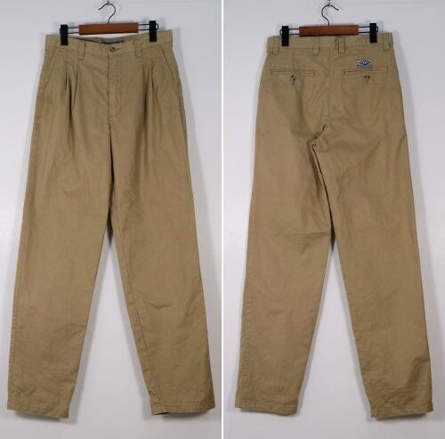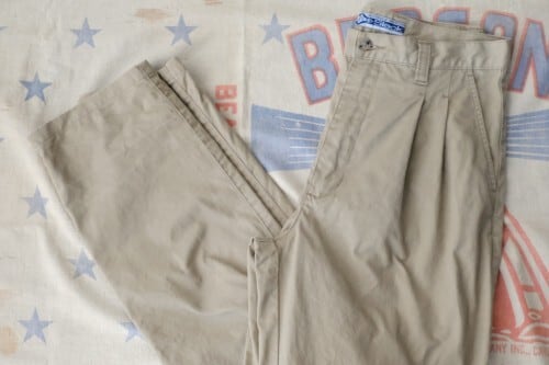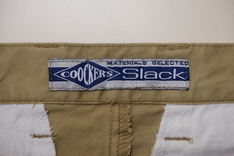 ヨーロッパのカジュアル・ウェア・ブランド"COOKER'S"から80年代頃と思われるチノ・パンツ。やや厚手でしっかりとした100%コットン・ツイル素材を使用し、やわらかなベージュの色味がナチュラルで落ち着いた雰囲気のアイテムです。腰まわりにボリュームのある股上の深いツータック、程よい広さのワタリから裾口に掛けてテーパードを効かせたすっきりとしたシルエットとなっています。着用の上で問題となるダメージ汚れはございませんが、右ポケット下に薄っすらとした汚れ、全体的に着用感のあるUSEDコンディションですのでご理解の上ご検討ください。ややオーバー・サイズのトップと合わせたゆるい雰囲気から、少し細みのトップと合わせてすっきりめのコーディネートまで幅広く使えるパンツです。