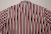 1904年にノースカロライナ州グリーンズボロで創業された"HUDSON OVERALL COMAPNY/ Wrangler"から90年代頃のシャツ。厚手でしっかりとした100%コットン(表記なし)を使用し、サーモンピンク×チャコール×ホワイトを組み合わせたマルチ・ストライプが印象的なアイテムです。肩幅に対して身幅がやや広い抜け感あるシルエット、柄合わせのされたフラップ付きの胸ポケット、バック・ヨークなどラングラーらしいディテールが魅力となっています。着用の上で問題となる大きなダメージ汚れはございませんが、後部の右脇上に小さな汚れ、襟や首まわり、袖口などにスレが点在する着用感の強いUSED品ですのでこのダメージを含めた風合いの良さを好まれる方におすすめ致します。デニムからスラックスまで幅広いボトムスにさらっと合わせるだけで個性的な雰囲気を演出でき、ラングラーのシャツとしてはかなり珍しい1本ですので気になる方は是非ご検討ください。