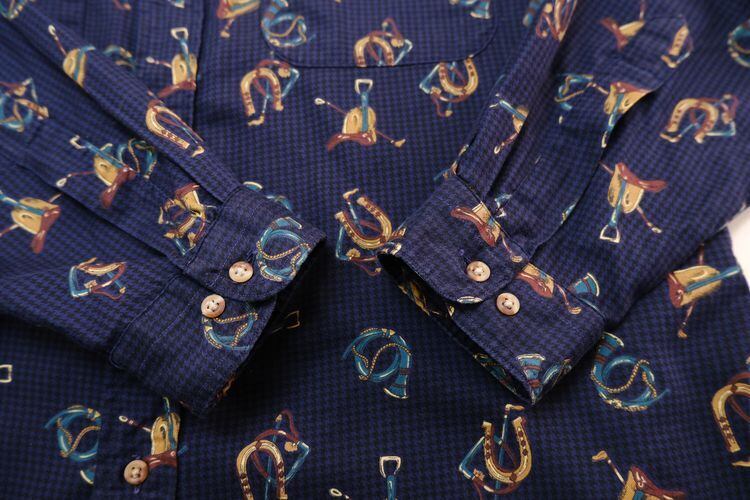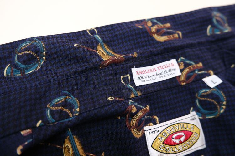 1910年に創業された"ABBEVILLE COLLECTION"から80年代頃と思われるシャツ。やや薄手でやわらかな肌触りが特徴の高級素材、100%コームド・コットンを使用し、ダークネイビーの渋い色味に細かなハウンド・トゥースと乗馬道具モチーフの総柄が映えるアイテムです。ざっくりとした着用に適したゆとりのあるシルエット、この年代らしい大きな両胸ポケット、コームド・コットンならでは身体のラインに馴染むやわらかなドレープ感も魅力となっています。着用の上で問題となるダメージや汚れはございませんが、全体的に着用感のあるUSEDコンディションですのでご理解の上ご検討ください。シンプルなボトムスにさらっと合わせるだけで大人っぽい雰囲気を演出でき、ジャケットやコートの中から覗くアクセントとしても楽しんでいただける1本です。