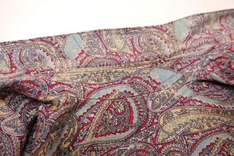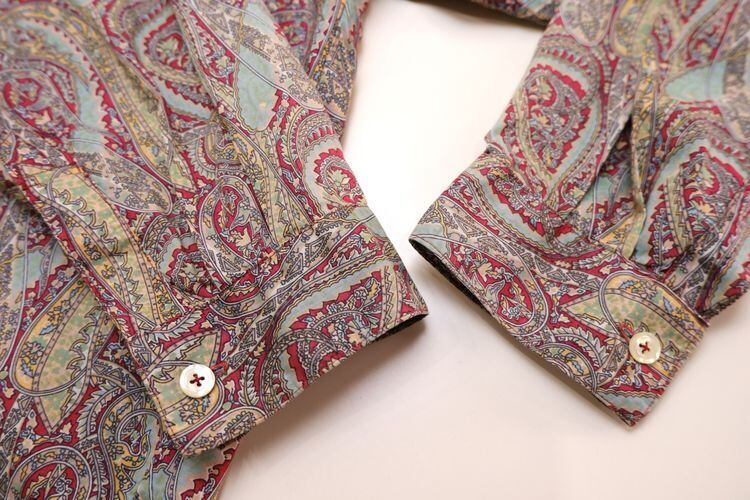 80年代ペイズリー柄コットンのロングシャツ。滑らかなローン生地に溶け込む、繊細なペイズリーのテキスタイルが美しいドレスシャツです。ざっくりとしたオーバーサイズシルエットにおしりがすっぽり隠れる長い着丈。深いVネックや斜めカットのポケットが特徴的なデザイン。薄手で目の詰まった生地は古いものならではの風合いに優れ、軽く肌触りの良い着心地も魅力です。コンディションは良く、とくに目立ったダメージは見られません。深いネックラインが女性らしさを引き立て、一枚での着こなしはもちろん、ノースリーブなどにさらりと羽織った着こなしもお勧めです。