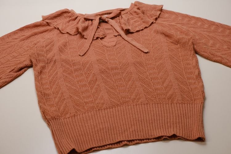 70年代後期アメリカ製コーラルピンク色のフリルカラーニット。ブラウス感覚で着用できるスタイルのローゲージニットセーターです。ラグランスリーブ、Vネックのプルオーバーにフリルカラーとリボン付きのデザイン、ウエストは絞られた太幅リブがウエストラインにフィットします。透かし模様編みのアクリルニットは軽く柔らかな着心地で、かさ張らずインナー使いとしても活躍してくれます。コンディションは良く、とくに目立ったダメージは見られません。フェミニンなディテールが目を引き、メンズライクなボトムスに合わせたギャップのある着こなしもお勧めです。