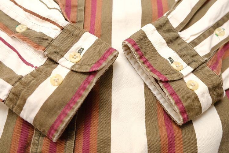 1984年に設立されたニューヨークを代表するブランドのひとつ"TOMMY HILFIGER"から2000年代初期頃のシャツ。程よい厚さでしっかりと張りのある100%コットンを使用し、クリーム×ブラウン×オレンジ×マゼンタを組み合わせたマルチ・ストライプがたいへん個性的な仕上がりのアイテムです。ざっくりとした着用に適した太めのシルエット、柄合わせのされた胸ポケット、その下に入るトミー・ヒルフィガーのライオン・ロゴ刺繍がアクセントとなっています。着用の上で問題となるダメージや汚れはございませんが、着用と経年による色ムラ(アタリ)のあるUSEDコンディションですのでこのこなれた風合いの良さを好まれる方におすすめ致します。プレーンのボトムスにさらっと合わせるだけで爽やかなカジュアルさを演出でき、ボタンを留めずにTシャツなどのトップの上にさらっと羽織る着こなしもおすすめです。