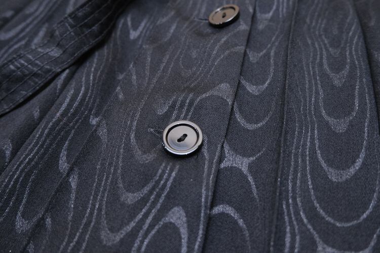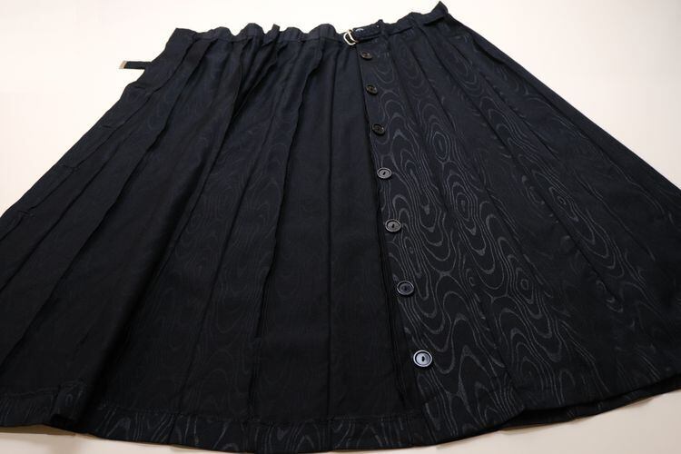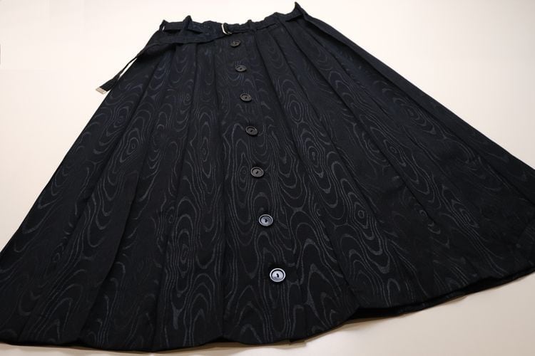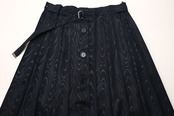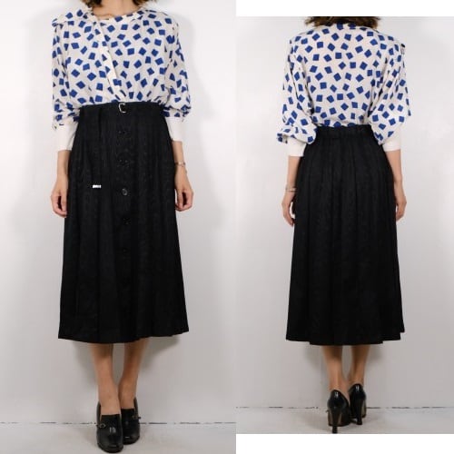 80年代ジャガードのアコーディオンプリーツスカート。プリーツの入った生地にベルトを直接通した、吊り下げ型のユニークなデザインが目を引くミドルスカートです。角度によって柄が浮かび上がるジャガード織りを使用し、さらに深みのある表情を添えています。おそらく100%ウールと思われる上質な生地が使用され、中厚手のためロングシーズンお楽しみいただけます。コンディションは良く、とくに目立ったダメージは見られません。サイズは自在に調整でき、フロントボタンを開けるとエプロン型になり、レイヤードの着こなしにも活躍してくれます。