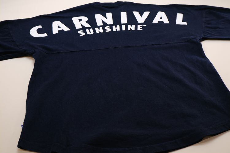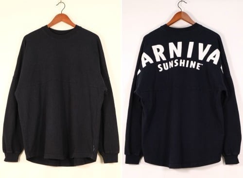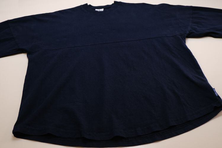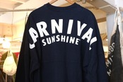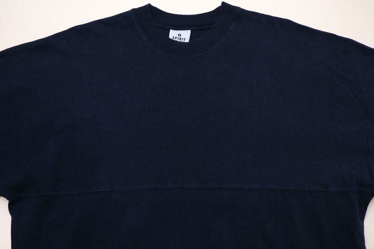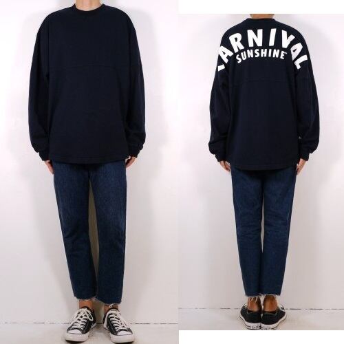 1983年にカリフォルニア州ロサンゼルスで創業されたカジュアル・ファッション・ブランド"SPIRIT JERSEY"から2000年代頃と思われるアメリカ製のフットボール・スタイル・シャツ。程よい厚さで柔らかな肌触りの100%コットンを使用し、身幅をたっぷりと取ったリラックス感あるシルエットが魅力のアイテムです。ドロップ・ショルダーに胸下で切り替えたパターン、ダークネイビー・ボディーのバックに肩から背中へ大きく施された"CARNIVAL SUNSHINE"のホワイト発泡プリントが印象的な仕上がりとなっています。着用の上で問題となるダメージをや汚れはございませんが、全体的に着用による毛羽立ちや色褪せのあるUSEDコンディションですのでご理解の上ご検討ください。シンプルなコーディネートのアクセント、または落ち着きある綺麗めのアイテムと合わせた遊び心ある大人の外しとしても楽しんでいただける1本です。