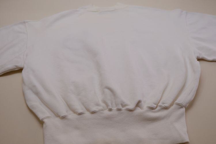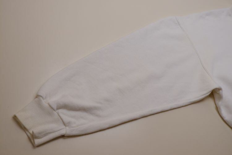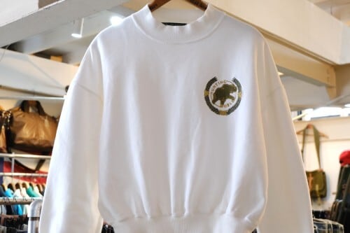 1965年ニューヨークにて設立された高級バッグブランド"HUNTING WORLD"より、90年代イタリア製のモックネックスウェット。コンパクトに着用できるレディースならではのシルエットが魅力の一品です。オフショルダーにゆったりアーム、幅広リブでウエストにフィットするジャスト丈が現代にも新鮮なシルエット。胸にブランドのマークのフェルトパッチ付き、ワッフルリブのモックネックも特徴です。100%コットン薄手の裏起毛スウェット生地は肌触りの良さとかさ張らない素材感が魅力となっています。コンディションとして多少の着用感があり、腹部に小さな汚れ、ネックラインに僅かに変色など見られますのでUSED品とご確認の上ご検討ください。ハイウエストパンツやタイトスカートなど幅広いボトムスと合わせやすく、個性を演出できる一品です。