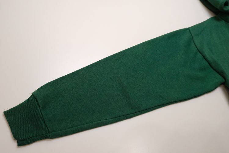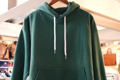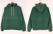 1901年設立アメリカの老舗アパレルブランド"Hanes"より、90年代頃のアメリカ製グリーン色無地フーディー。こちらはユニセックスでお勧めの一品です。全体的にスタンダードなバランスの印象のクラシックフィットシルエットにセットインスリーブ、やや横長のカンガルーポケットが特徴のデザイン。薄手のスウェット生地は古いものならではの風合いと洗いこなれた味わいがあります。コンディションとして多少の着用感があり、全体的に生地の変色や毛羽立ちなど見られますのでUSED品とご理解の上ご検討ください。生地がかさ張らないためジャケットのインナー使いとしてもバランス良く、深く鮮やかなグリーンの色みが効かせ色としても役立ち、ロングシーズン活躍してくれそうです。