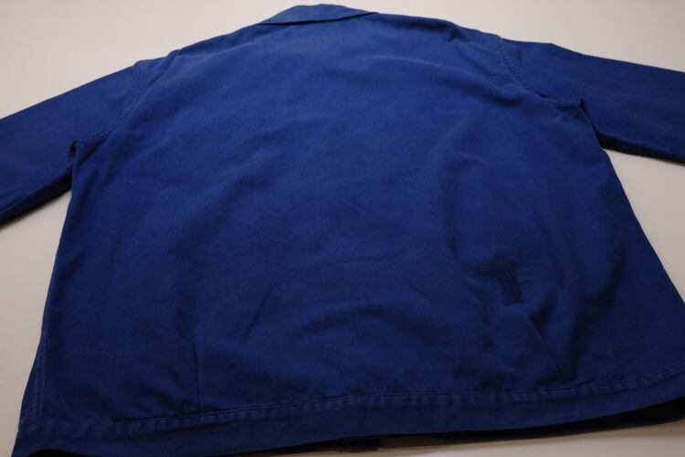 80年代頃と思われるユーロ・ワーク・ジャケット。厚手でしっかりと張りのある100%コットン・ツイルを使用し、深みがありつつ明るさを感じるロイヤルブルーの上品な色味が目を惹くアイテムです。ざっくりとした着用に適したオフショルダーのゆとりあるシルエット、小ぶりな襟、左胸に配されたイタリア・ボローニャに所在するソリューション・カンパニー"L'OPEROSA"の蜂ロゴのパッチによるアクセント、そしてユーロ・ワーク・ジャケットとしては珍しいスラッシュ・ポケットが大きな特徴となってます。着用の上で問題となるダメージや汚れはございませんが、左袖のカフスより上、後部の左肩にそれぞれ小さなダメージ、後部の右腰にダメージ補修、全体的に着用感のあるUSED品ですのでご理解の上ご検討ください。さらっと羽織るだけでワーク・スタイルを演出でき、これから着込むほどに生地が馴染み、洗濯を重ねるたびにアタリや色落ちが現れ、ご自身だけの1本に仕上がっていきます。