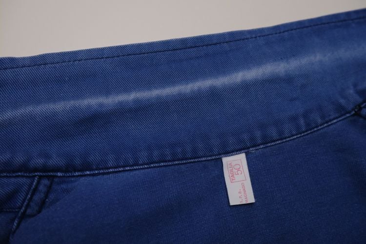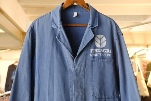 80年代頃と思われるユーロ・ワーク・ジャケット。程よい厚さの100%コットン・ツイルを使用し、着用と経年によりフェードしたライトブルーの色味とくったりと変化したやわらかな生地感がたいへん風合いの良いアイテムです。肩幅に対して身幅がやや抑えられたすっきりめのシルエット、ワーク・ジャケットとしては珍しいノッチド・ラペル、そしてイタリアを代表する自動車メーカー"FIAT"『フィアット』の、かつての農業機械ブランド"FIATAGRI"『フィアットアグリ』のリーフを模したロゴマークが左胸と背面に大きくプリントされた個性的な仕上がりとなっています。着用の上で問題となるダメージや汚れはございませんが、全体的に着用による色褪せや毛羽立ちの強いUSED品ですので、この1点ものらしい雰囲気を好まれる方におすすめ致します。シンプルなトップ×ボトムスにさらっと羽織るだけでヴィンテージ・テイストあるコーディネートを演出でき、ノッチド・ラペル×細身のシルエットで綺麗めのスタイリングを好まれる方にたいへんおすすめです。