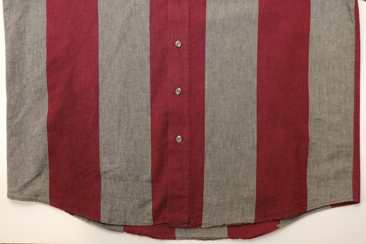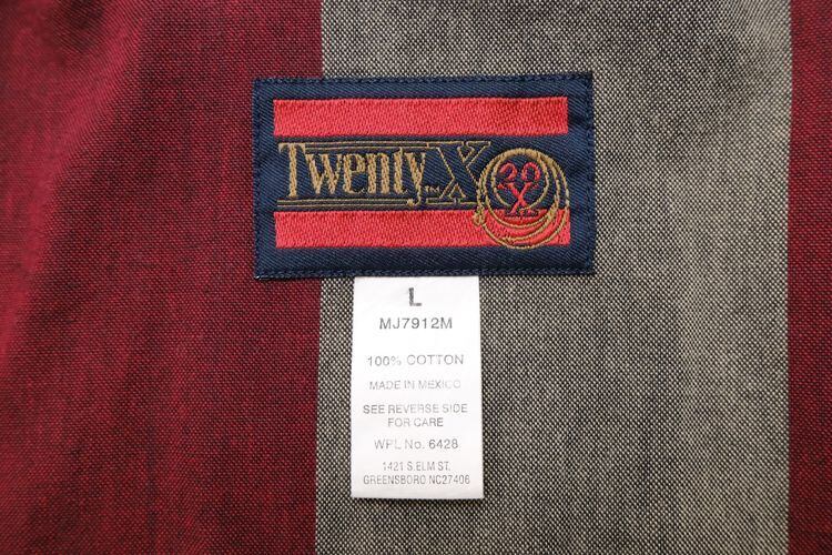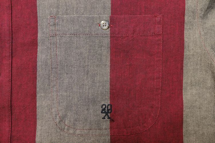 1904年にノースカロライナ州グリーンズボロで創業された"HUDSON OVERALL COMAPNY/ Wrangler"からパフォーマンスにフォーカスしたライン"Twenty X"から90年代頃のシャツ。程よい厚さでぱりっと張りのある100%コットンを使用し、ワインレッドとソルトアンドペッパーの2色で構成された太いストライプがたいへん渋い雰囲気のアイテムです。リラックスした着用に適したボリュームあるシルエット、小ぶりなボタンダウン・カラー、しっかりと柄合わせのされた前合わせと胸ポケット、刺繍で入る"20X"ロゴがアクセントとなっています。全体的に着用した様子のあまり感じられないたいへん良いコンディションですが、あくまでUSED品ですのでご理解の上ご検討ください。カジュアルな雰囲気ながら大人っぽい渋い色味がたいへん良く、ダークトーンになりがちな寒い季節のジャケットやコートに合わせた挿し色としても楽しんでいただける1本です。
