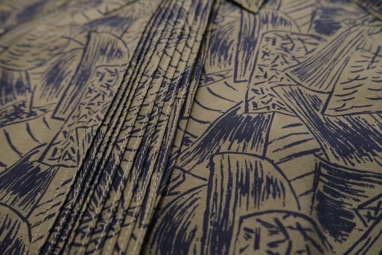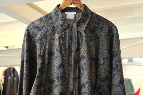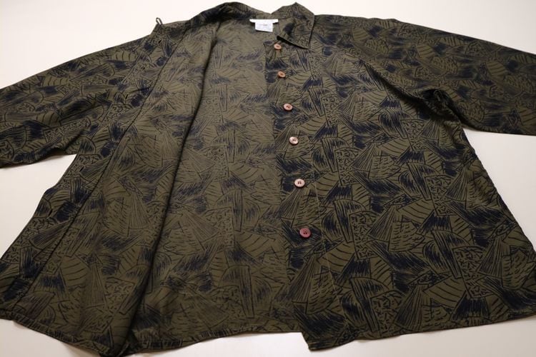 1970年設立、洗練されたデザインが支持を集めるニューヨークを拠点としたライフスタイルブランド"JONES NEW YORK"より、90年代プリント柄レーヨンのラグランスリーブシャツ。ユニークなディテールが詰まった、大人の遊び心を感じる一品です。比翼ボタンに前立てのピンタック、たっぷりとした袖にきゅっと絞ったカフスが特徴のデザイン。オリーブ色ベースのドローイング調の抽象柄が、渋く媚びない印象に仕上がっています。さらりと滑らかな落ち感が特徴のレーヨン生地は、透け感なくロングシーズン着用いただけます。コンディションは良く、とくに目立ったダメージは見られません。細部まで歪みのない仕立ての美しさが着る人を引き立てる逸品です。