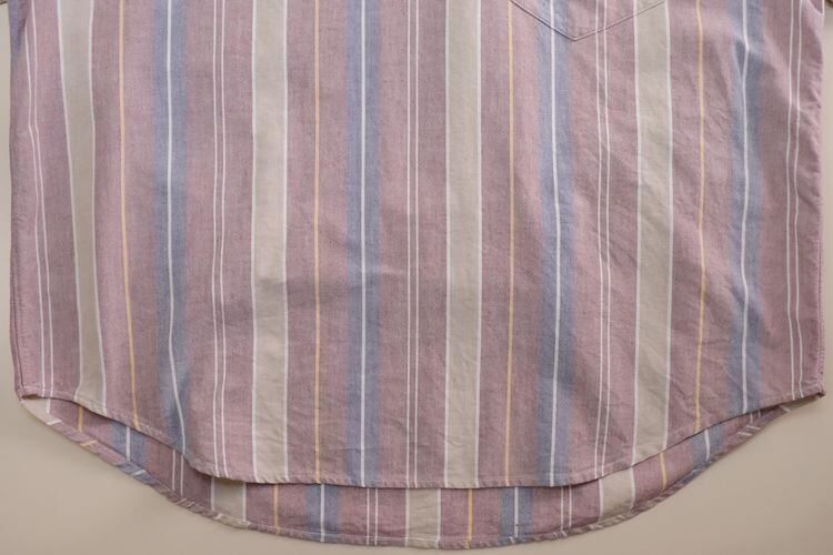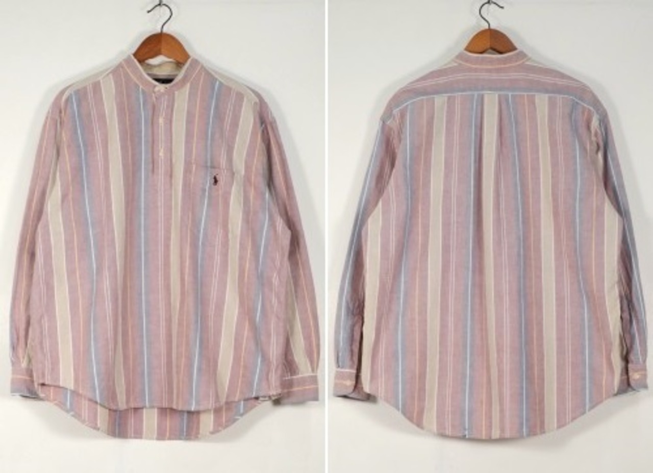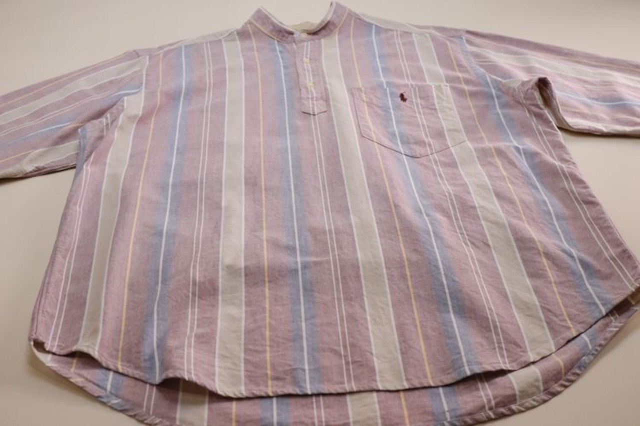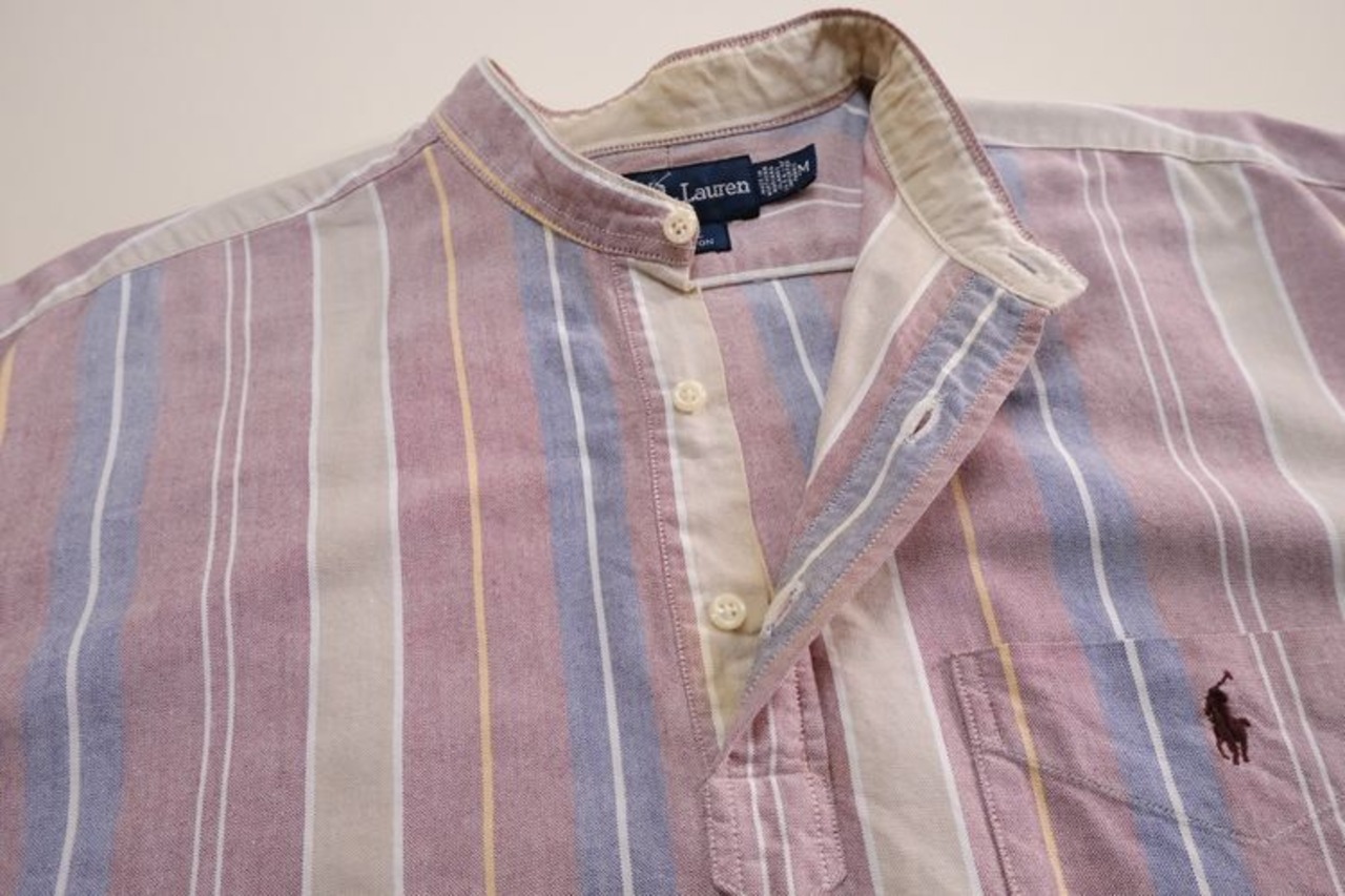 1967年にニューヨークで設立された世界的なファッション・ブランド"Ralph Lauren"から90年代後期頃のシャツ。程よい厚さでしっかりと織られた100%コットン・オックスフォードを使用し、アッシュがかったワインレッドをベースに様々な色のマルチボーダーがカジュアルな印象のアイテムです。程よくリラックスした着用に適したシルエット、ノーカラー×3つボタン・プルオーバー、しっかりと柄合わせのされた胸ポケット、ワインレッドのワンポイント"PONY"刺繍がアクセントとなっています。着用の上で問題となるダメージや汚れはございませんが、左袖と後の中央裾口上にそれぞれ小さな汚れのあるUSEDコンディションですのでご理解の上ご検討ください。デニムからスラックスまで幅広いボトムスにさらっと合わせるだけでカジュアルながら上品で清潔感ある印象を演出でき、ジャケットやコートの中から覗くアクセントとしても楽しんでいただける1本です。