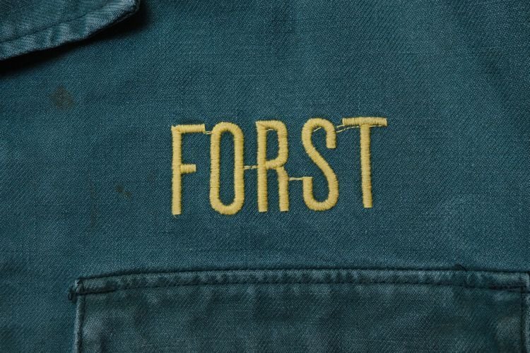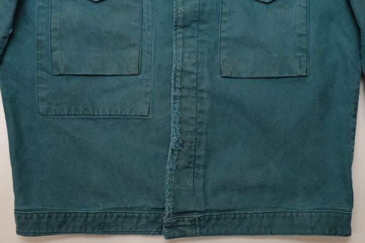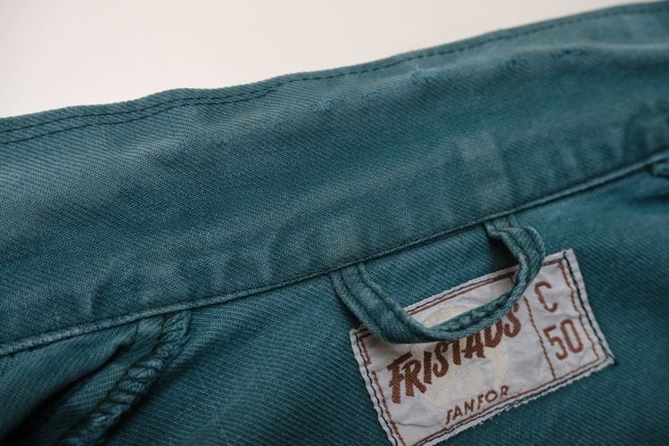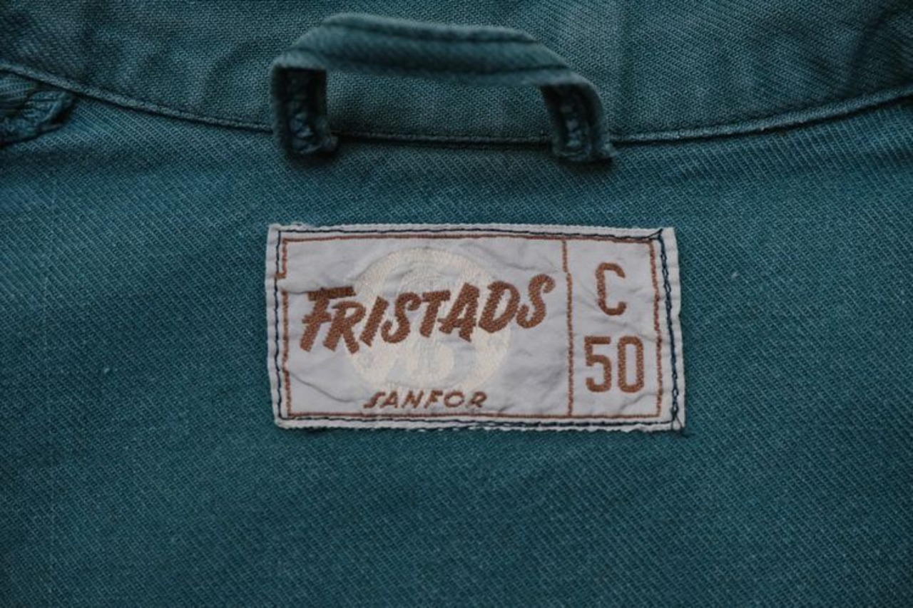 1925年にスウェーデンのボロースで創業されたワークウェア・ブランド"FRISTADS"から70年代頃のモールスキン・ジャケット。起毛の施された厚手でやわかな肌触りのモールスキン(100%コットン)を使用し、着用と経年によりフェードしたグリーンの色味と素材の表情がたいへん雰囲気の良いアイテムです。細すぎず太すぎない程よいシルエット、後部のアクション・プリーツ、フラップ付きの両胸ポケット、左胸に入る"FROST"のネーム刺繍によるアクセント、そして現代の装いにも馴染むショート丈も魅力となっています。着用の上で問題となる大きなダメージや汚れはございませんが、両袖口、右袖の肘まわり、前合わせにスレやダメージ(全体の風合いを損なわないよう、あえてリペアは施していません)、全体的に着用感の強いUSED品ですので普段から古いものをご愛用の方におすすめ致します。ワーク・ウェアだからこそ実用的でシンプルなつくりが素材の存在感をより引き立て、年々希少になりつつあるオールドのモールスキン・アイテムですので気になる方は是非ご検討ください。