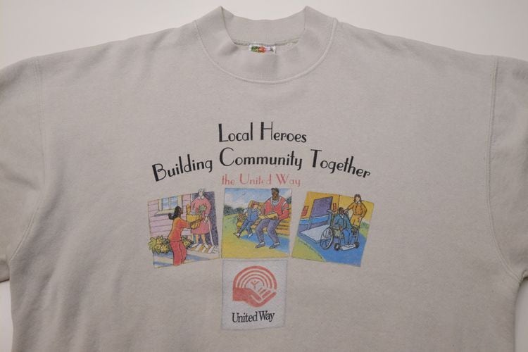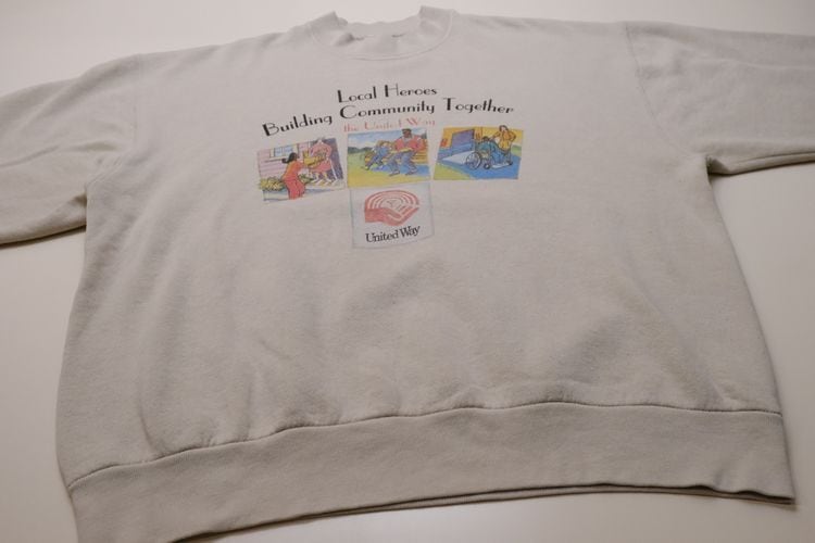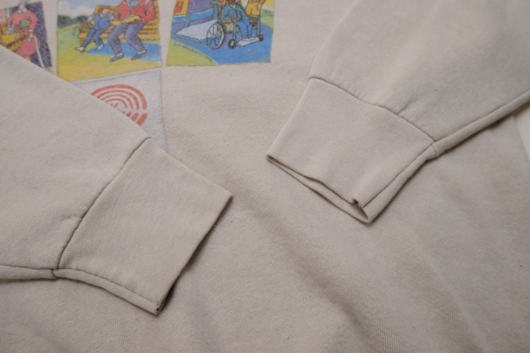 90年代のプリント柄スウェット。淡いグレーベースの色みに溶け込むような、優しいイラストに癒される一品です。ゆったりオーバーサイズシルエットに深いアームのセットインスリーブ、幅広リブのネックラインが特徴のデザイン。やや薄手の裏起毛スウェット生地は柔らかくて軽い着心地が良く、着用と経年により変化した色味とこなれた素材の表情に1点ものらしい味わいを感じます。コンディションとして多少の使用感があり、全体的にくたびれ感、裏地に毛羽立ちなど見られますのでUSED品とご理解の上ご検討ください。ユニセックスでお楽しみいただけ、ゆるりとした抜け感が雰囲気良く、オーバーサイズの着こなしにもお勧めです。