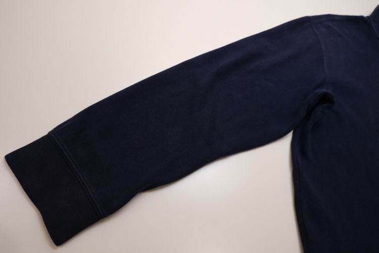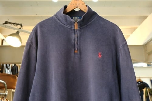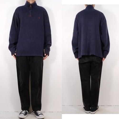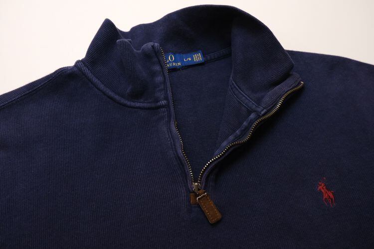 1967年にニューヨークで設立された世界的なファッション・ブランド"Ralph Lauren"からクォータージップ・セーター。ハイゲージでしっかりと編み立てられた100%コットンの素材に、ネイビーの落ち着いた色味が大人っぽい雰囲気アイテムです。ざっくりとした着用に適したオフショルダーのゆとりあるシルエット、プル・オーバーのクォーター・ジップ、左胸に刺繍で施されたワインレッドのワンポイント"PONY"がアクセントとなっています。着用の上で問題となるダメージや汚れはございませんが、全体的に色褪せや毛羽立ちの強いUSEDコンディションですのでご理解の上ご検討ください。身体のラインにくったりと馴染む着心地の良さと、流行り廃りに左右されないデザインのため1枚持っているとたいへん重宝すると思います。