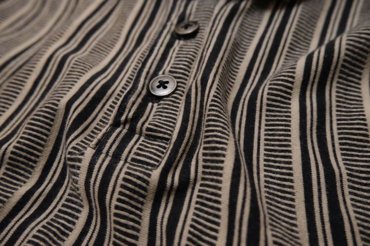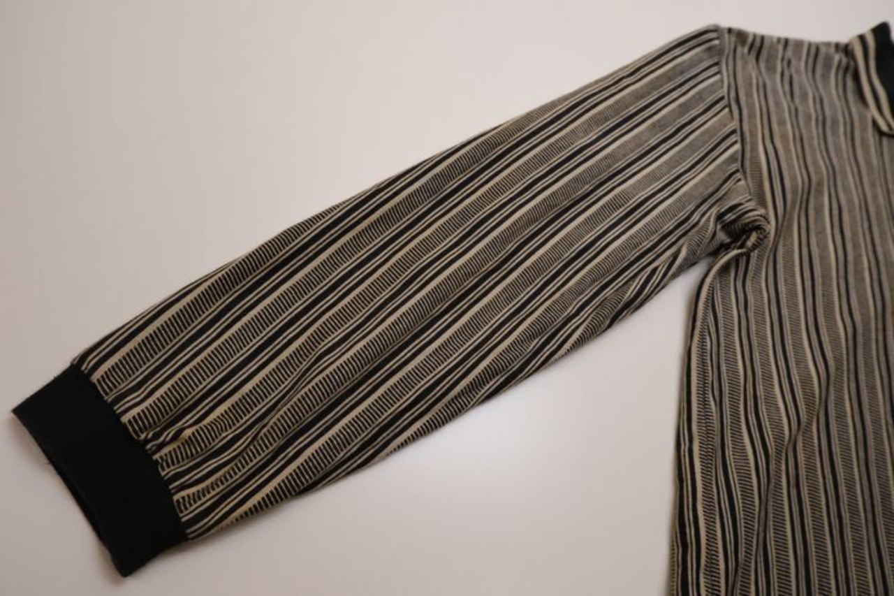 90年代ジオメトリック・ストライプの長袖ポロシャツ。渋いカラーリングと野暮ったさの残るデザインが憎めないアイテムです。ゆったりめのアームとやや長めの着丈が特徴のシルエットに、ライン使いのラペルとメタル調のボタンがポイントになったデザイン。100%コットンの生地は肌触り良く、幾何学的パターンのストライプも個性的な仕上がりになっています。コンディションとして多少の着用感があり、全体的に色褪せが見られますのでUSED品とご確認の上ご検討ください。ありそうでなかなか無い絶妙な表情は、シャープな素材などプラスしたモード感ある着こなしや、スラックスなど合わせた渋めスタイルなど、新鮮なスタイリングをお楽しみいただけます。