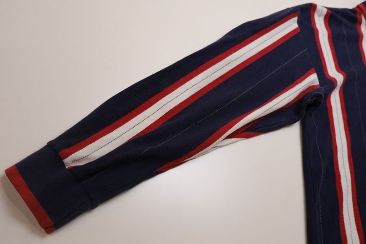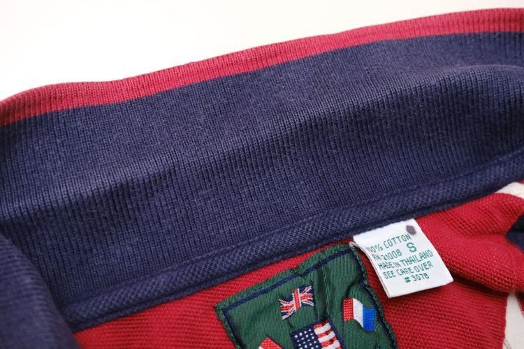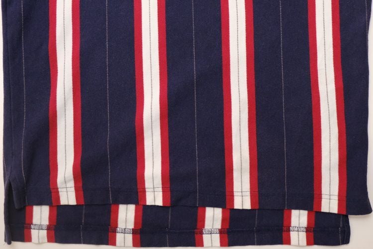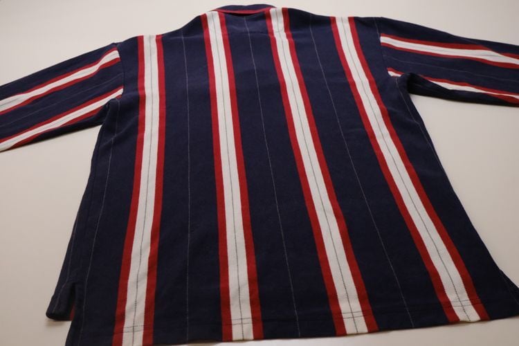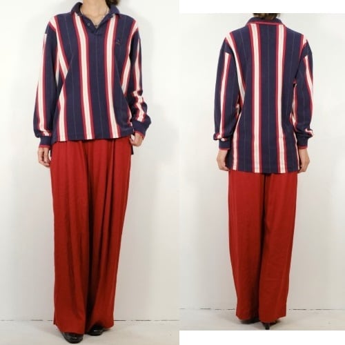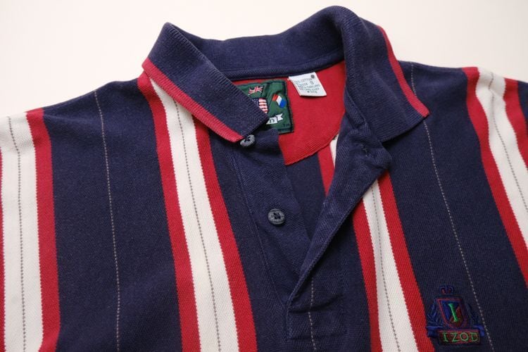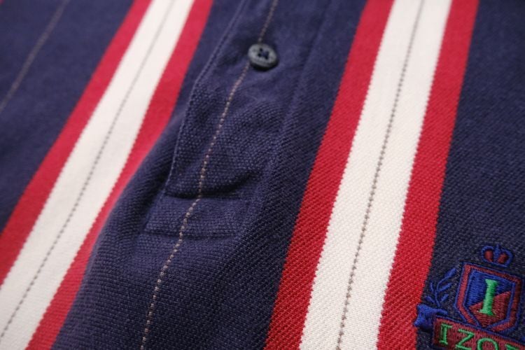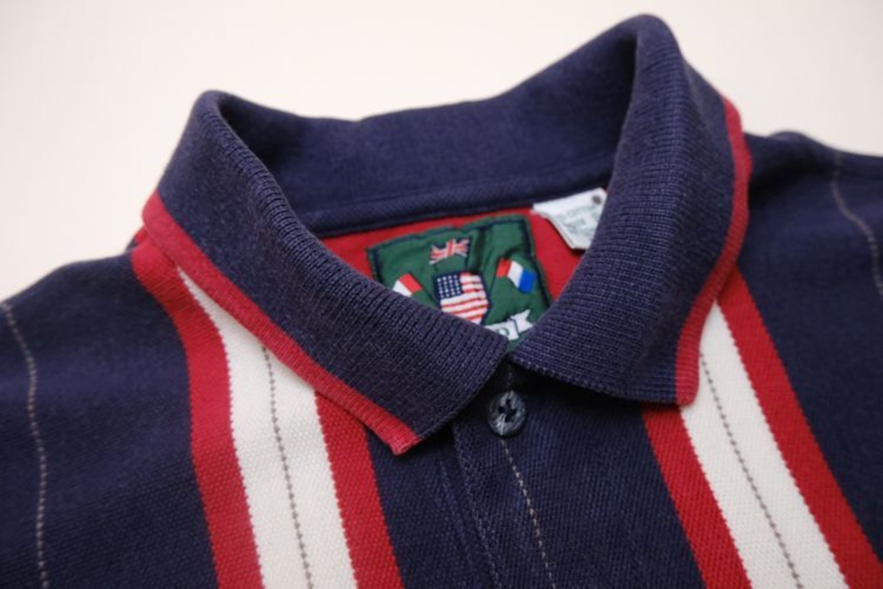 かつて"LACOSTE"のライセンスを所有していたことでよく知られる、1937年設立アメリカ・ニューヨーク発のファッションブランド"IZOD"より、ストライプ柄の長袖ポロシャツ。大胆な大判ストライプが目を引く一品です。前後で長さの違う着丈が特徴のシルエットに、胸のエンブレム刺繍入りのデザイン。生地はポロシャツではスタンダードな鹿の子を使用し、くたり柔らかな素材感で動きやすく軽い着心地が魅力です。コンディションとして多少の着用感があり、全体的に色褪せが見られますのでUSED品とご確認の上ご検討ください。シンプルなボトムスに合わせるだけで存在感のある、ユニークな表情を持ったアイテムです。