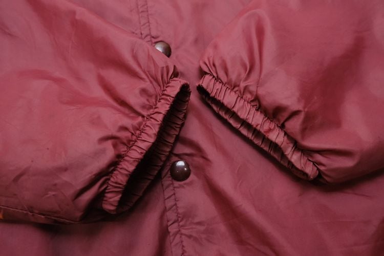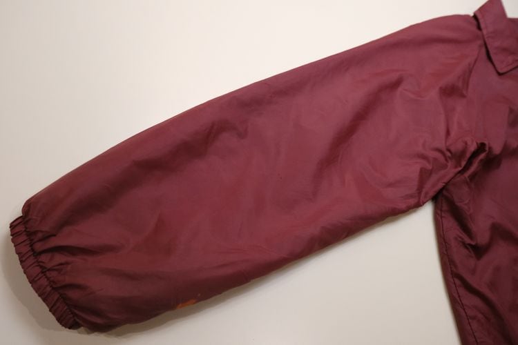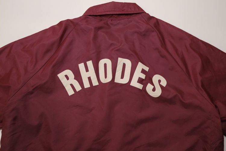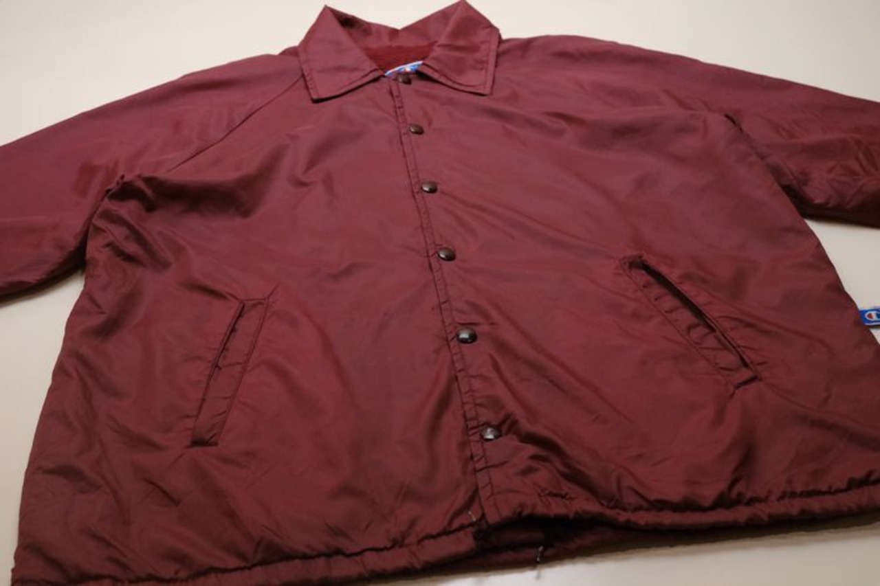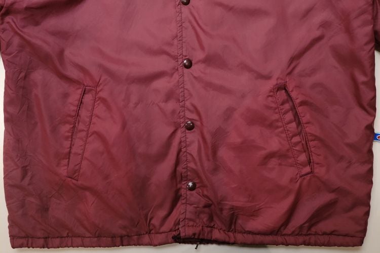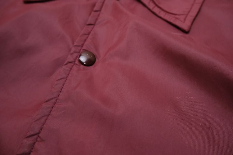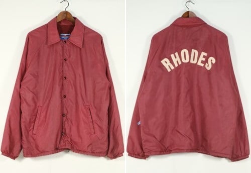 1919年"Champion Athleticwear"としてニューヨーク州ロチェスターで設立されたアスレチックウェア・ブランド"Champion"から80年代頃のアメリカ製・コーチ・ジャケット。シェルに薄手でなめらかな肌触りの100%ナイロン(表記なし)を使用し、ボディー・ライニングにやや薄手のアクリル・ボアが張られたほんのりと温かな着心地のアイテムです。ざっくりとした着用に適したボリュームあるシルエット、すっきりとした見た目を生むラグラン・スリーブ、シンプルなボタン・アップ×スラッシュポケット、そしてワインレッドをベースに後部に大きくプリントされた"RHODES"が個性的な仕上がりとなっています。着用の上で問題となるダメージや汚れはございませんが、右袖に変色、ライニングの首まわりにスレとダメージ補修、全体的に経年と着用感の強いUSED品ですので普段から古いものをご愛用の方におすすめ致します。幅広いトップ×ボトムスにさらっと羽織ることのできる気軽な着用感がたいへん良く、ワインレッドの渋い色味とコーチ・ジャケットらしいシンプルな仕上がりで長くご愛用いただけると思います。