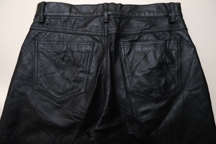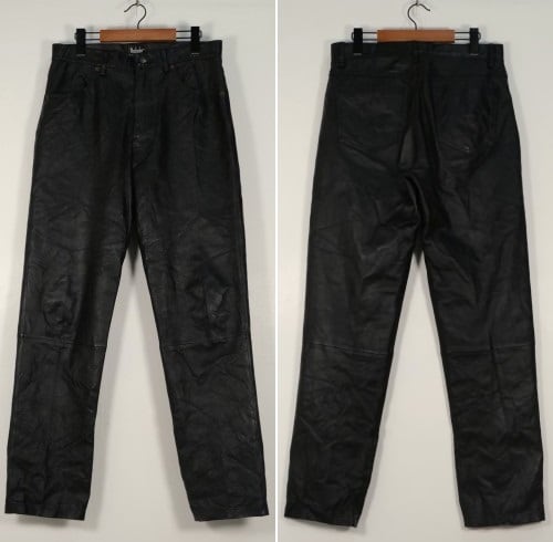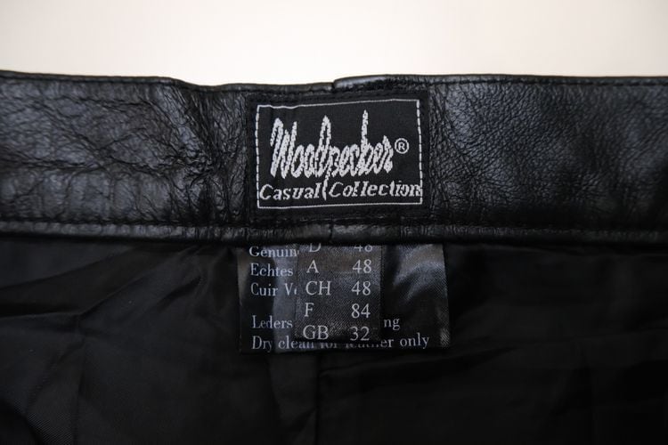 ヨーロッパのレザー・ウェア・ブランド"Woodpecker"から90年代頃と思われるレザー・パンツ。やや薄手でしなやかなカウハイド・レザーを使用し、程よい光沢とマットな美しいシボの表情が上品な仕上がりのアイテムです。浅すぎず深すぎない股上にすっきりとした印象の腰まわり、やや細いワタリから裾口にかけてしっかりとテーパードを効かせたスマートなシルエット、膝下までライニング(ナイロン)が張られているため履き心地の良さも魅力となっています。着用の上で問題となるダメージや汚れのない良いコンディションですが、全体的に保管によるシワがありますのでご理解の上ご検討ください。※履き込んでいくとシワは減っていきます。シンプルなトップと合わせるだけで存在感のあるスタイルを演出でき、カジュアルながら無骨で大人っぽい雰囲気を演出できる1本です。
