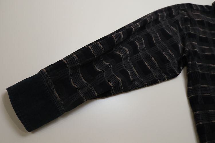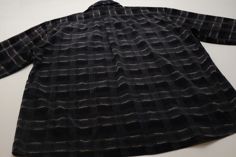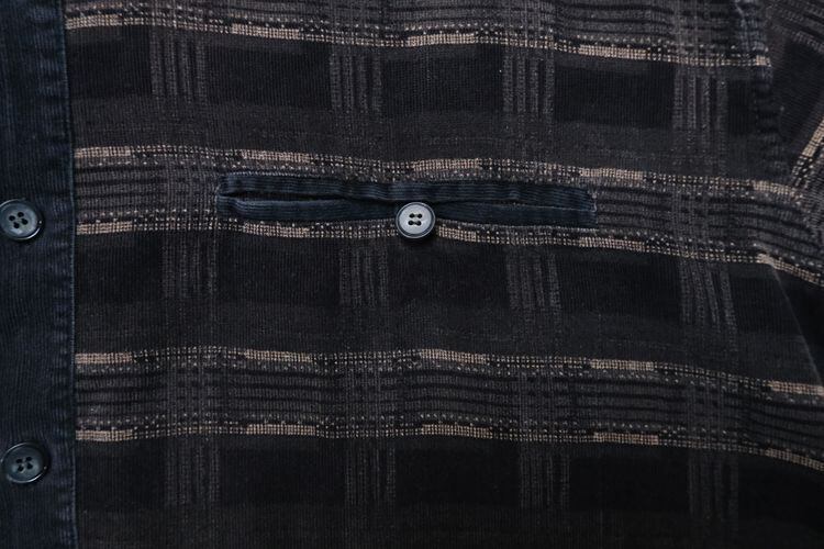 1861年にニューヨークで創業された老舗の高級デパートメント・ストア"Bloomingdale's"『ブルーミングデールズ』から80年代頃と思われるシャツ。肌触りの良さと温かみに優れた細畝のコーデュロイ(表記なし:100%コットン)を使用し、ブラックからグレーへとグラデーションをかけた格子柄がたいへん渋い雰囲気のアイテムです。この年代らしいオフショルダー×アームホールの広いざっくりとしたシルエット、、襟や前立て、カフスの切り替え、左胸に施された両玉縁のポケットがアクセントとなっています。着用の上で問題となるダメージや汚れはございませんが、全体的に毛羽立ちや色褪せのあるUSEDコンディションですのでご理解の上ご検討ください。※偏った畝の潰れや色ムラはありません。コーデュロイの温もりとトーンの抑えられた深みある色合いが魅力で、デニムやチノと合わせた落ち着いたスタイルや、ボタンを留めずにスウェットの上にさらっと羽織ったリラックス感あるコーディネートにもおすすめです。