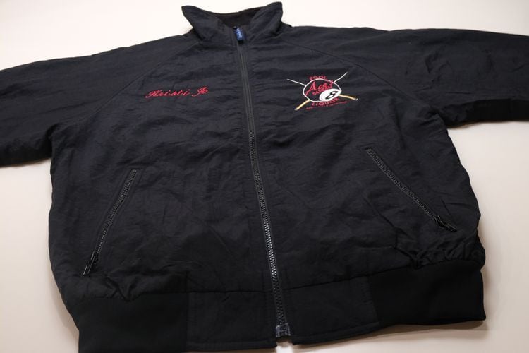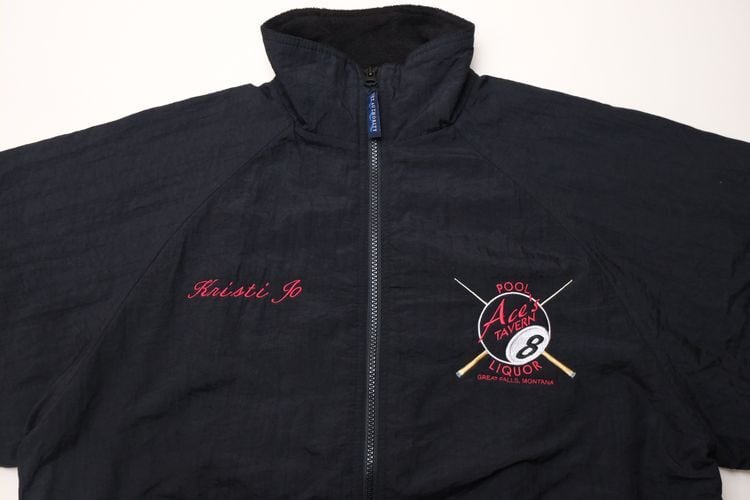 1971年にワシントン州イサクアで創業された"PORT AUTHORITY"からジップアップ・ジャケット。シェルに薄手でシワのある100%ナイロンを使用し、内側のボディ・ライニングにポリエステル・フリース、スリーブ・ライニングにナイロン×ポリエステル・フィリングが張られた温かな着心地のアイテムです。程よいボリュームあるシルエットにすっきりとした見た目を生むラグラン・スリーブ、シンプルなジップアップ・フロント、ジップ付きのスラッシュ・ポケット、刺繍で施された右胸に"Kristi Jo"、左胸にはモンタナ州グレートフォールズに所在するプール・ホール&リカー"ACE'S TAVERN"のビリヤードの象徴でもあり"幸運"や"勝負運"を意味する8ボール・ロゴが個性的な仕上がりとなっています。着用の上で問題となるダメージや汚れはございませんが、全体的に着用感のあるUSEDコンディションですのでご理解の上ご検討ください。幅広いトップ×ボトムスにさらっと羽織ることのできる気軽なカジュアル感と、ブラックのスマートな色味とストア・ユースらしい刺繍がたいへん良く、こちらはスタッフ"Kristi Jo"にユニフォームとして配布された販売用ではない1点もののアイテムですので気になる方は是非ご検討ください。