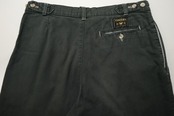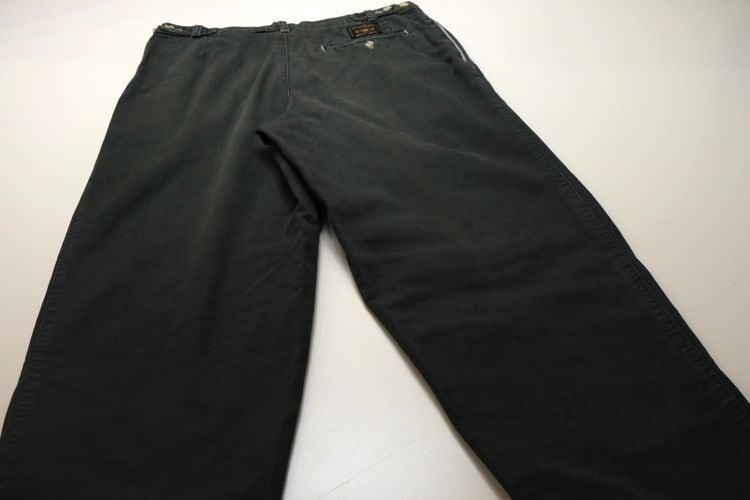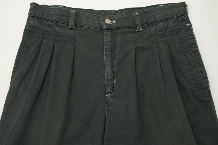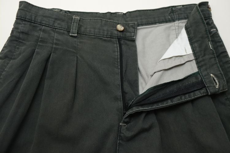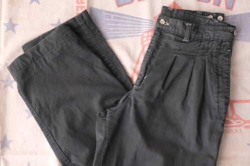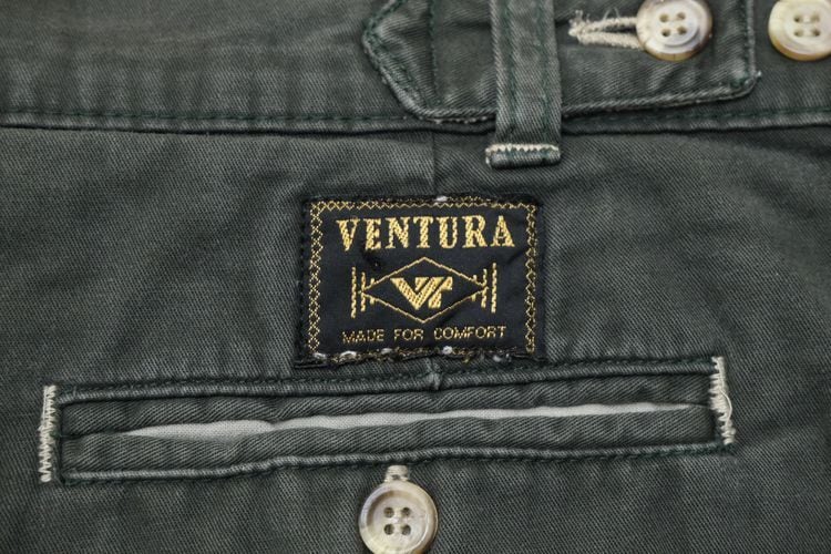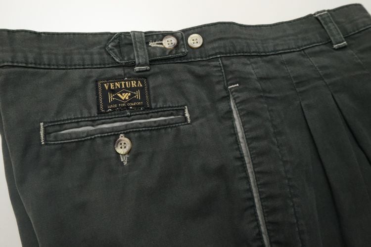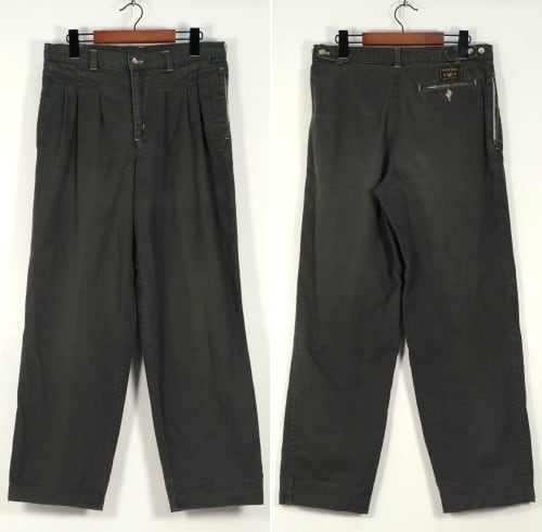 ヨーロッパで展開されていたカジュアル・ウェア・ブランド"VENTURA"から80年代頃と思われるパンツ。程よい厚さでしっかりとした100%コットン・ツイル(表記なし)を使用し、スモーキーグリーンのフェードした色味がたいへん渋い雰囲気のアイテムです。腰回りにゆとりのある股上の深いスリー・タック、太いワタリから裾口にかけてテーパードを効かせたシルエット、サイドのアジャスター、そして裾口まで張られた薄手のコットン・ライニング(表記なし)によるつくりの良さも魅力となっています。着用の上で問題となるダメージや汚れはございませんが、全体的に着用と経年による色褪せや毛羽立ちのあるUSEDコンディションですのでこの風合いの良さを好まれる方におすすめ致します。ややオーバー・サイズのトップと合わせたゆるい雰囲気から、少し細みのトップと合わせてすっきりめのコーディネートまで幅広く使えるパンツです。