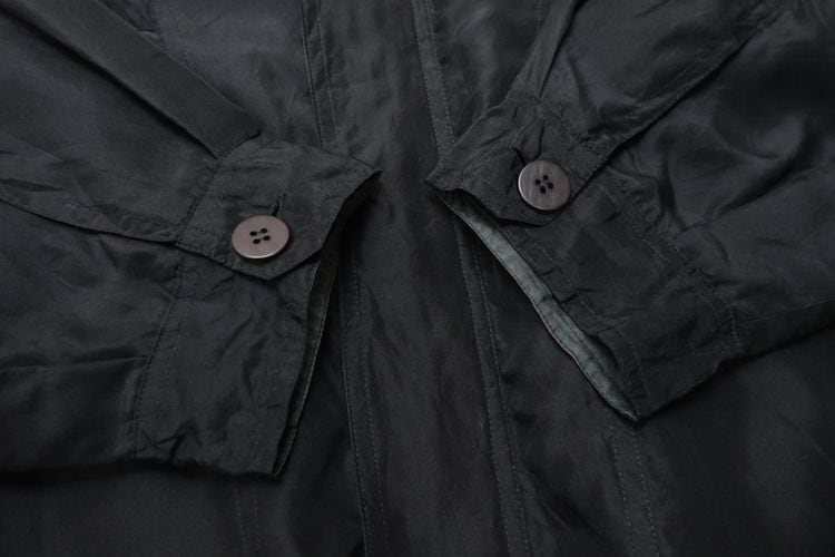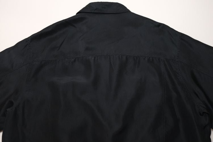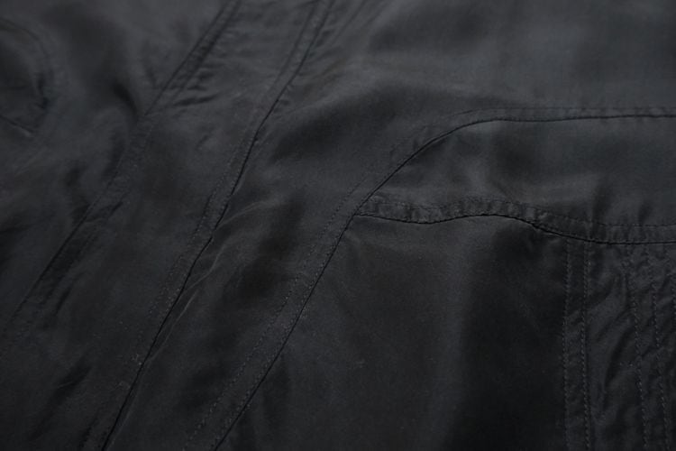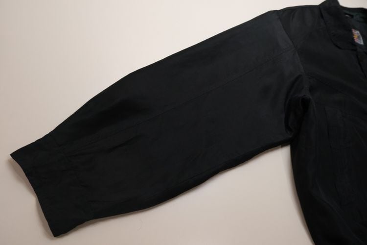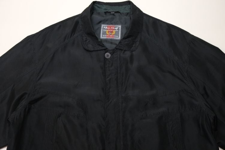 ドイツのカジュアル・ウェア・ブランド"HENRY MOREY"から80年代頃と思われるジャケット。しなやかで程よい光沢のある100%シルクを使用し、ほんのりとアッシュ掛かった単色ブラックの色味がスマートな雰囲気のアイテムです。オフショルダーと広いアームホールによるざっくりとしたサイジング、ボタン×ジップアップ・フロント、大きなスラッシュ・ポケット、襟や胸で切り替えたパターン、そして袖口まで張られたポリエステルのライニングによる袖通しの良さも魅力となっています。着用の上で問題となるダメージや汚れはございませんが、全体的に着用感のあるUSEDコンディションですのでご理解の上ご検討ください。幅広いコーディネートにさらっと合わせるだけでルーズなゆるい雰囲気が演出でき、軽量でありながらもシルクは繊維と繊維の間に細かな空気の層が多くあるため着心地の温かさも魅力となっています。