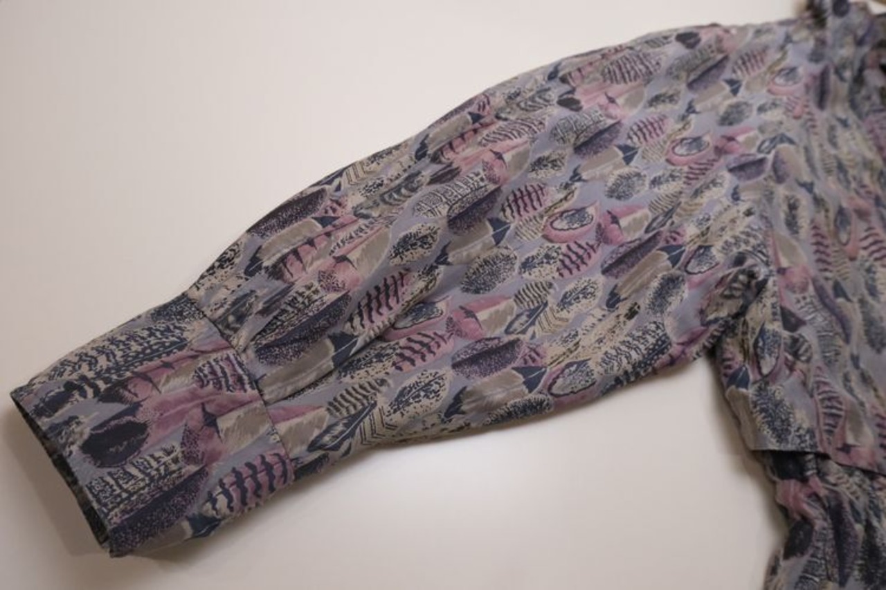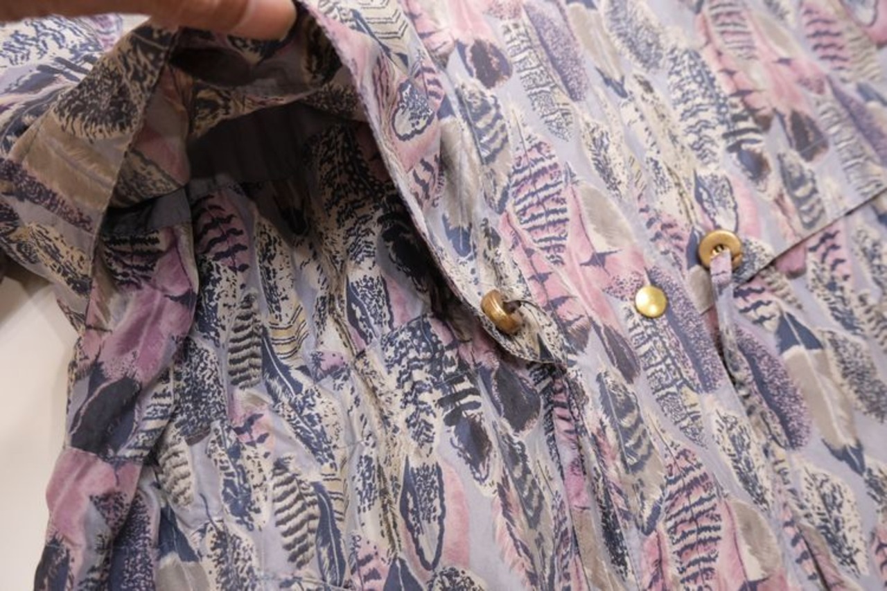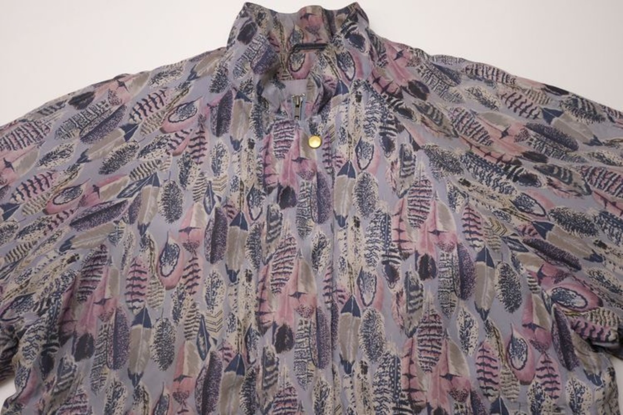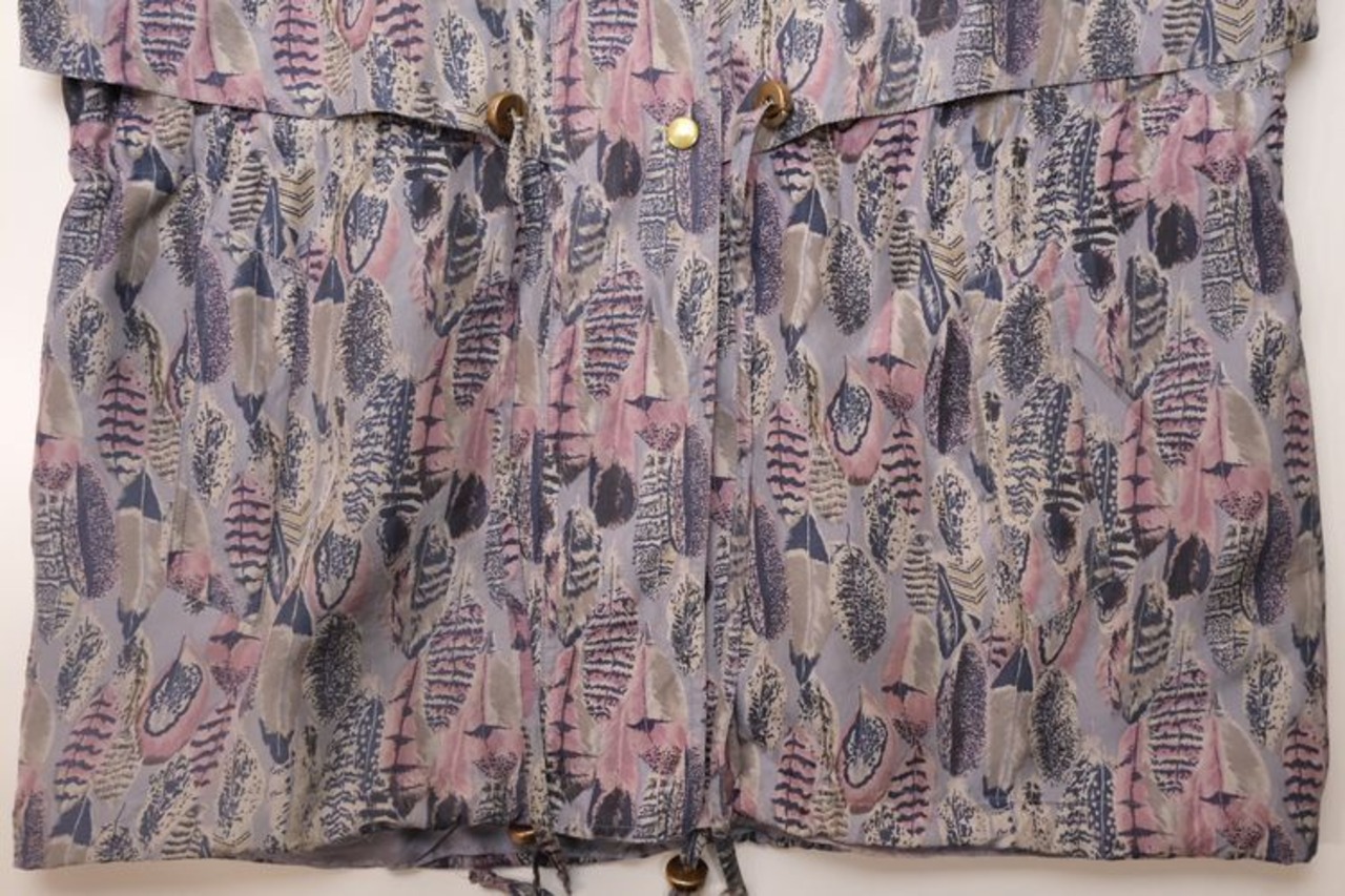 80年代フェザープリント柄のシルクジャケット。ウエストと裾にあしらわれた長いドローストリングが特徴的な、デザイン性の高いブルゾンジャケットです。ラグラン切り替えのバルーンスリーブに長いカフス、ハイネック、ウエストヨークが特徴のデザイン。ウエストと裾の紐で好みのシルエットを作ることができます。裏地付きの100%シルク生地はたいへん軽い素材感ながら保温性にも優れ、ロングシーズンお楽しみいただけます。コンディションとして多少の着用感があり、襟ぐりや裏地に変色、一番下のスナップボタンの欠損など見られますのでUSED品とご確認の上ご検討ください。淡い色みに溶け込むフェザーのテキスタイルも雰囲気良く、さらりと羽織るだけで人と違ったスタイリングが完成します。